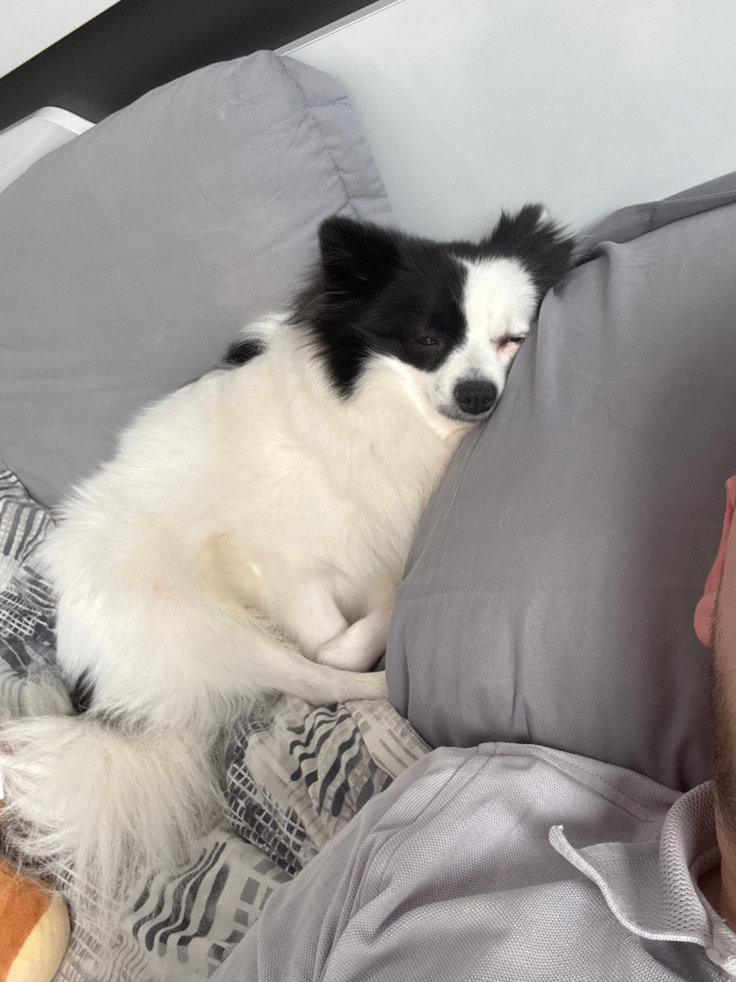 A black and white dog is lying on a bed next to a person. The dog is nestled against a gray pillow, and the person is wearing a gray shirt. The bed has gray sheets and a patterned gray and white blank…read more