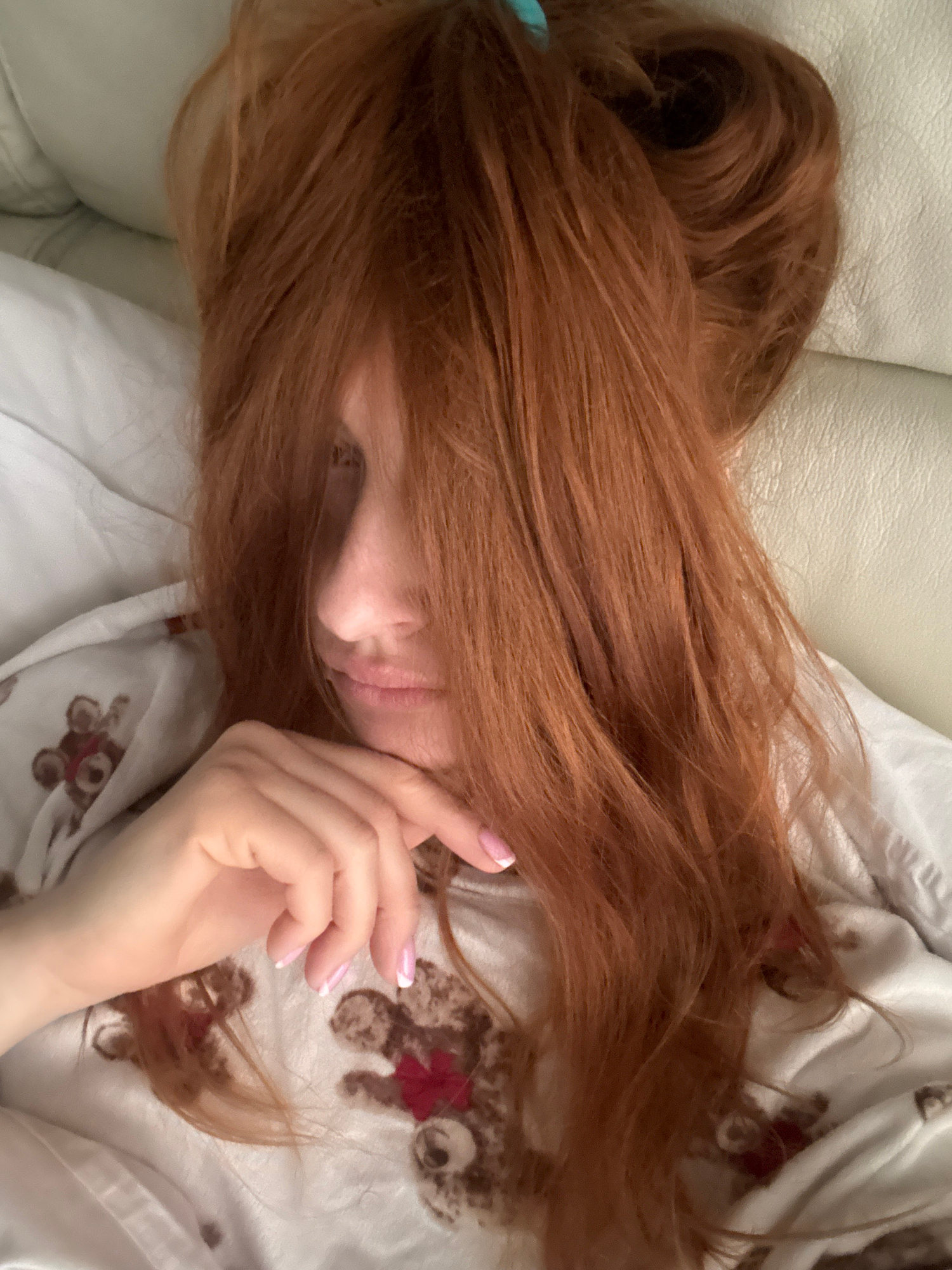 A woman with long, red hair rests on a white leather surface, partially covered by a white blanket patterned with teddy bears. Her face is partially obscured by her hair, with her right hand resting nā¦read more
