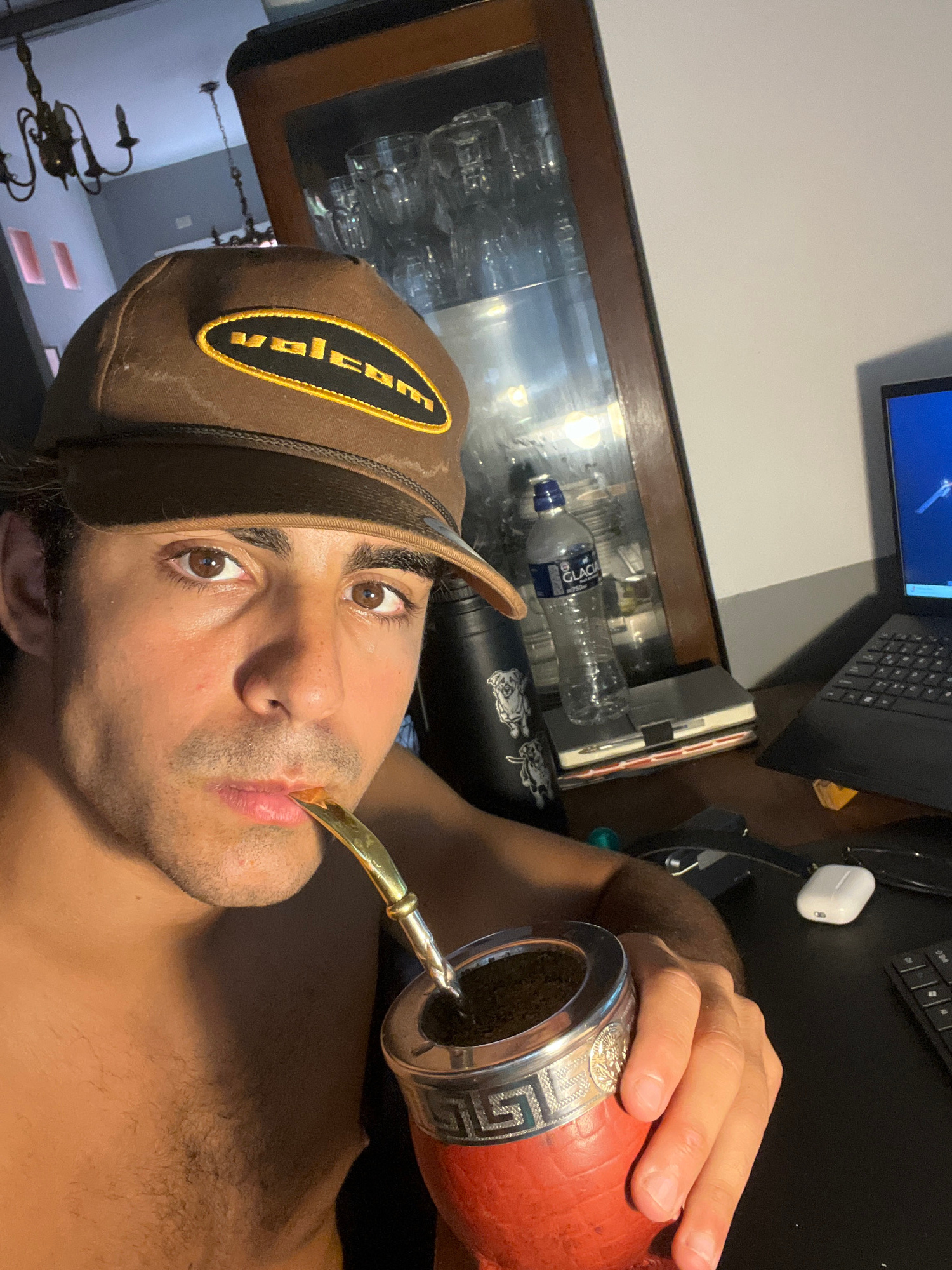 The image is a close-up, slightly upward-angled selfie of a man indoors, likely in Avellaneda, Argentina, engaging in the ritual of drinking mate. The main subject is a man, appearing to be in his 20…read more