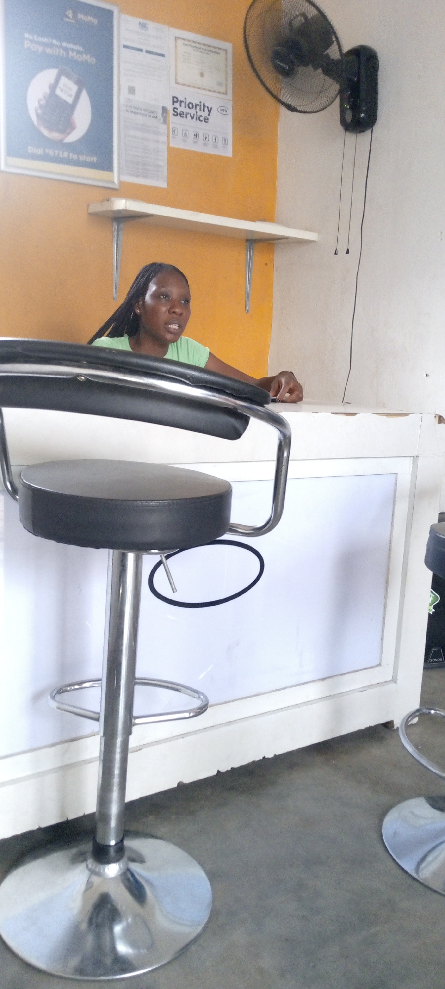 The image depicts the interior of what appears to be a service-oriented establishment in Zango-ndaji, Nigeria. A woman with braided hair, wearing a green t-shirt, stands behind a counter with a white…read more