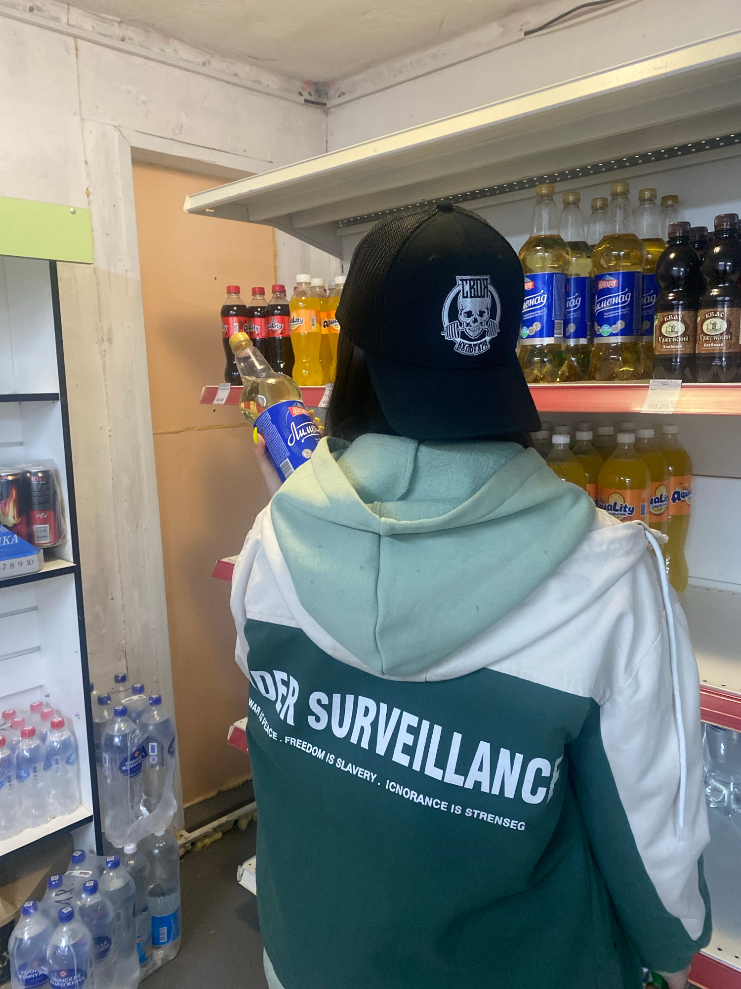A person wearing a black cap with a skull emblem and a green and white hoodie is reaching for a bottle of "Limonad" soda on a shelf in what appears to be a small shop or market. The text on the hoodie…read more
