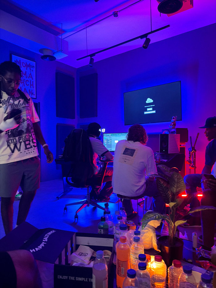 A dimly lit room bathed in blue and purple hues reveals a creative space. Two men work on computers, one in a chair, and another on the floor. A wall-mounted monitor displays audio mixing software. So…read more