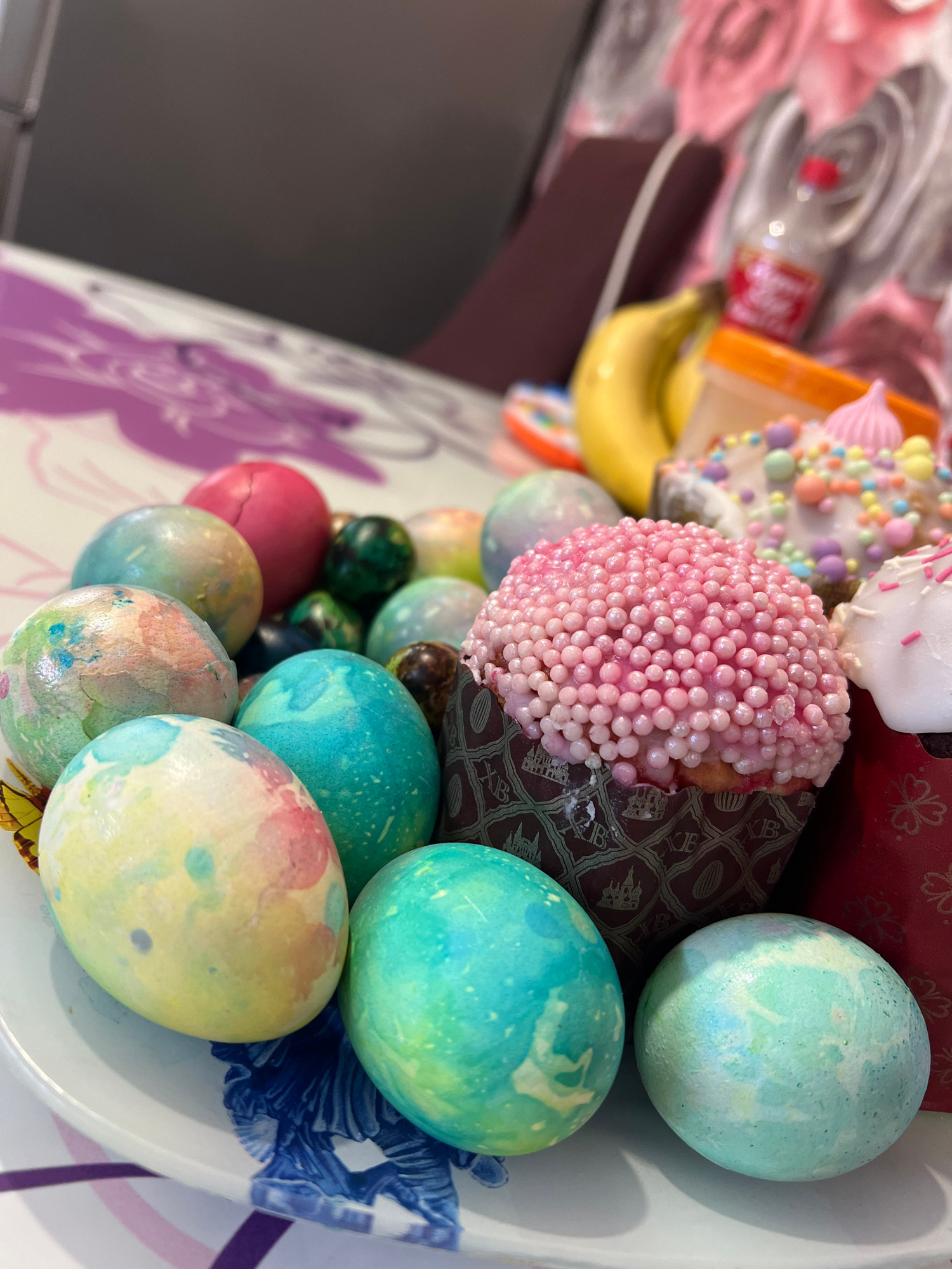 A high-angle shot displays a plate of decorated Easter eggs and Kulich cakes. The eggs are dyed in various colors, including blue, green, yellow, and red, with a mottled or marbled effect. The Kulich…read more