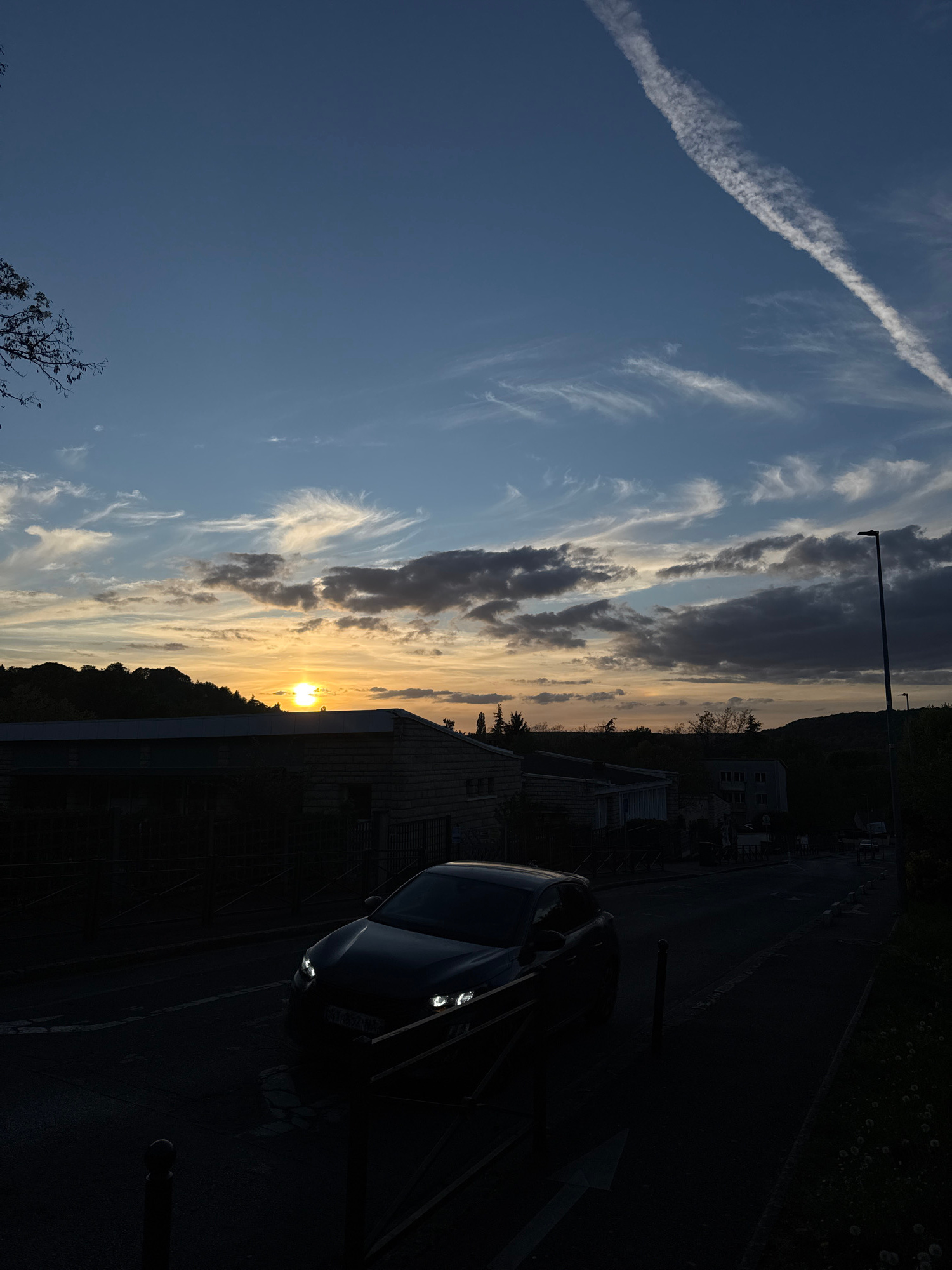 The image captures a tranquil sunset scene in Bures-sur-Yvette, France, presented in a portrait orientation as if looking sideways across a landscape. The sun is low on the horizon, glowing bright ora…read more