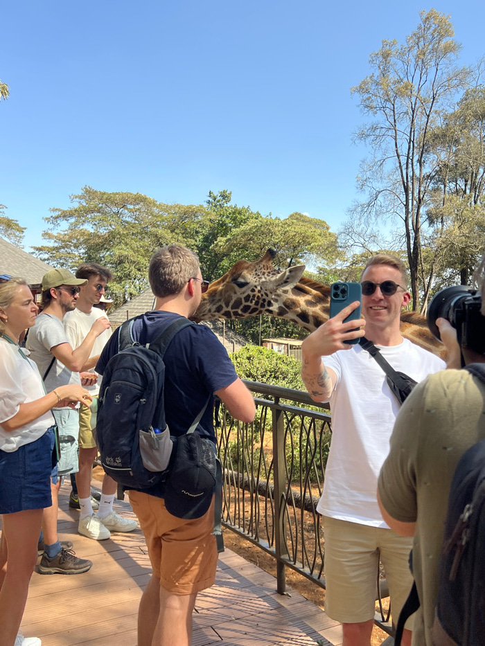 The image depicts a bright, sunny outdoor scene at the Giraffe Centre in Nairobi, Kenya, where multiple individuals are interacting with a giraffe on an elevated wooden viewing platform. In the foreg…read more