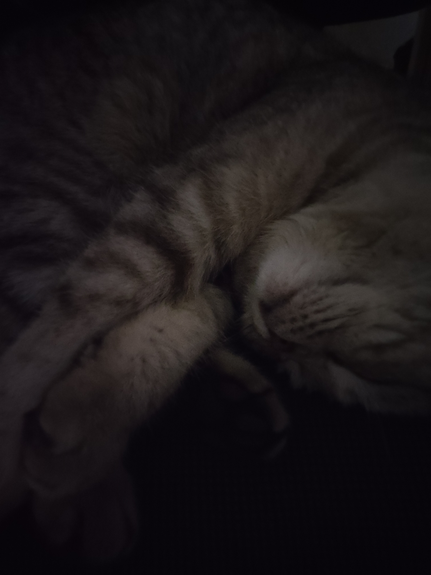 The image depicts a close-up view of a tabby cat sleeping. The cat is curled up with its paws near its face. The fur is a mix of light and dark shades, creating a striped pattern. The lighting is dim,…read more