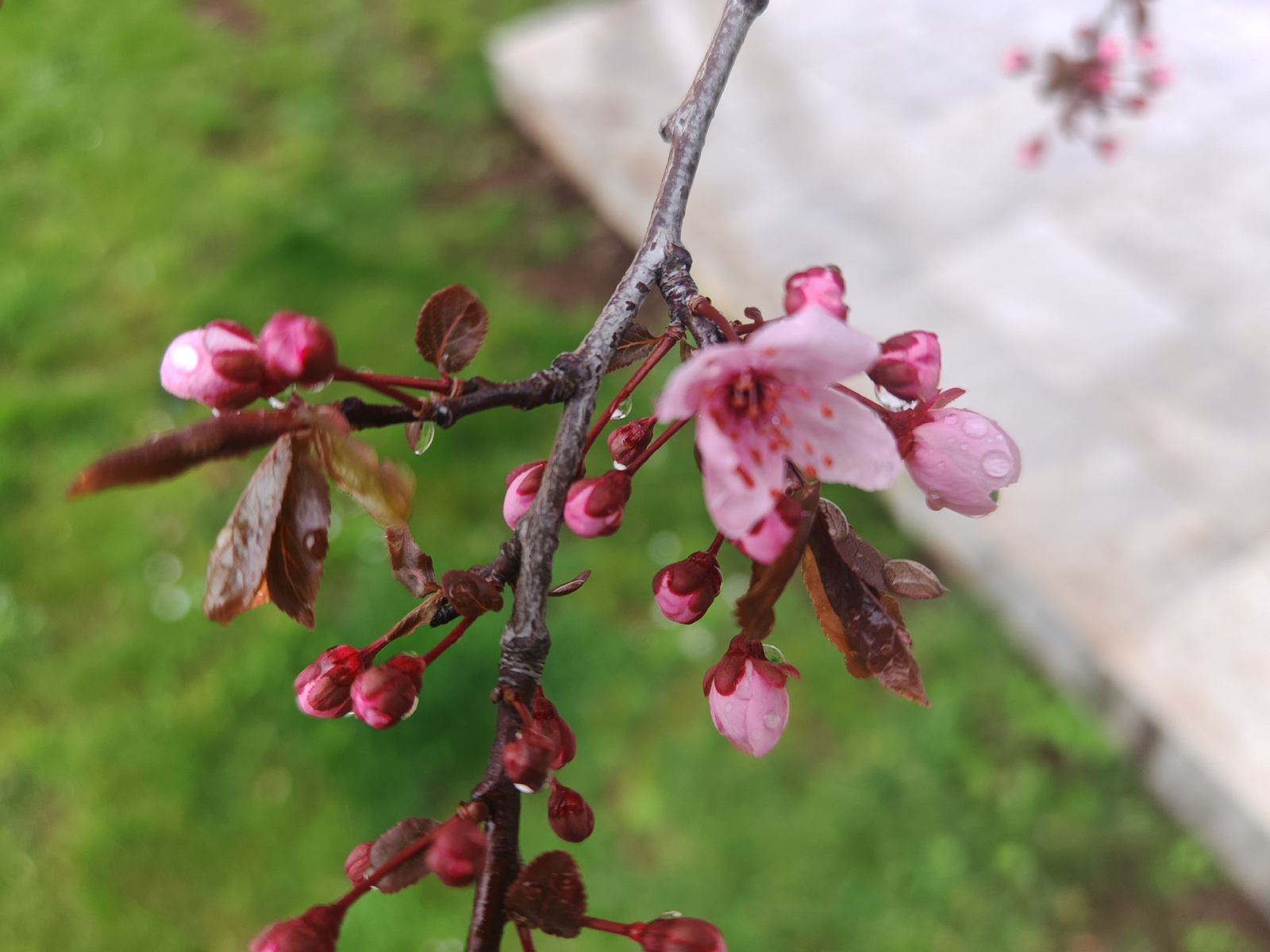 The image shows a close-up of a branch with pink flower buds and a few partially open flowers. Water droplets are visible on the buds and leaves. The leaves are brownish-red. The background is a blurr…read more