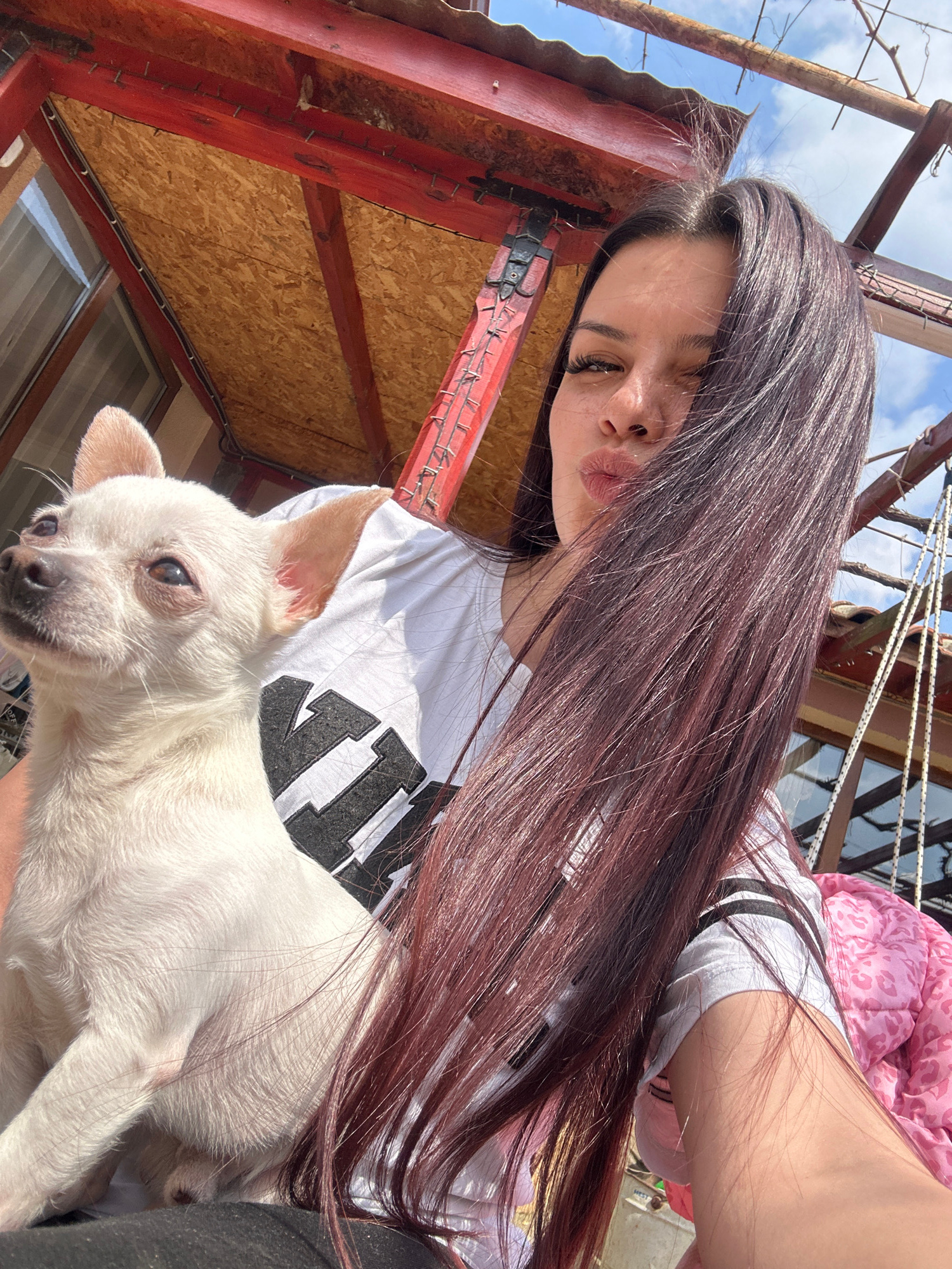 A woman with long, dark reddish-brown hair is holding a white Chihuahua-type dog. She is wearing a white t-shirt with black lettering, and a pink jacket is visible in the background. The location appe…read more