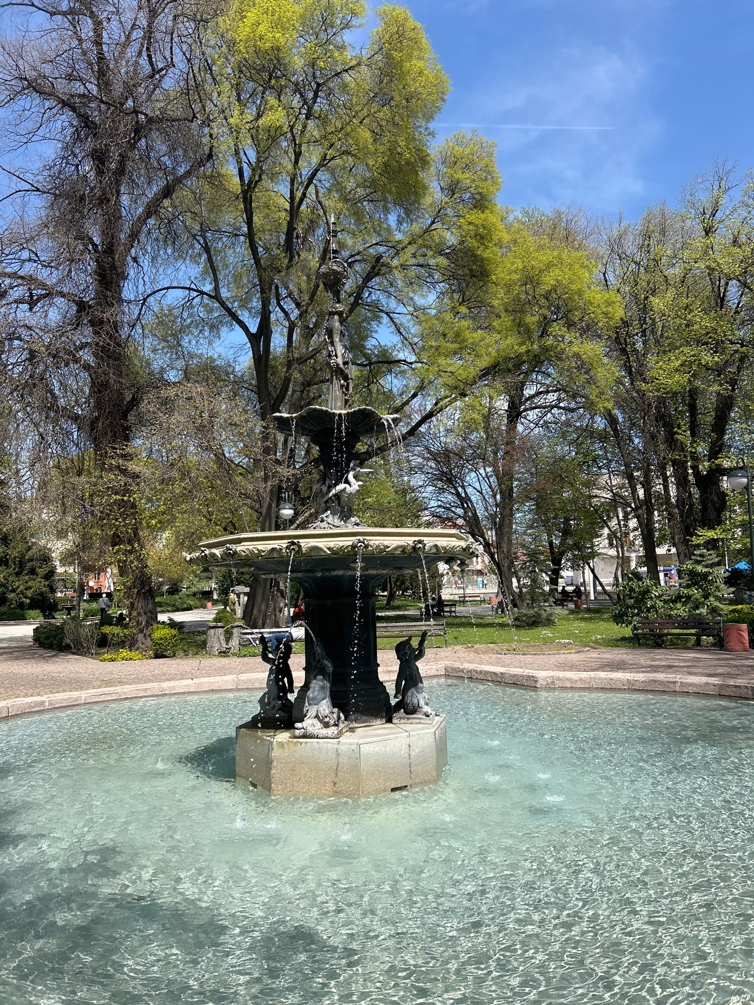 This vertical-format image depicts a serene public park scene in Plovdiv, Bulgaria, bathed in bright sunshine, likely during early to mid-spring. The central focus is a large, ornate fountain featurin…read more