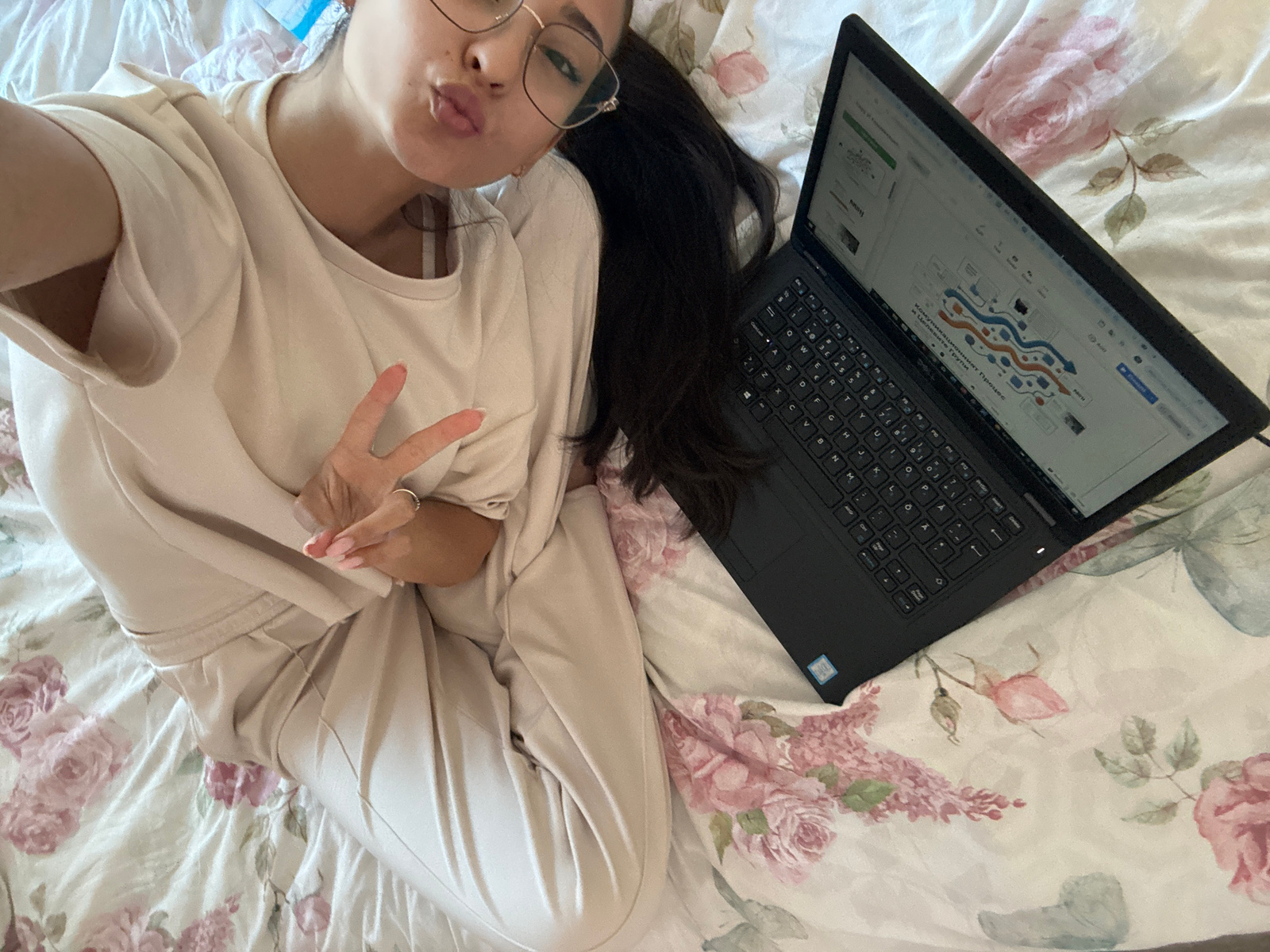 A woman lies on a bed with a floral pattern, positioned next to a laptop. She is making a peace sign with her hand. The laptop displays a diagram titled "Комуникационният Процес" (Communication Proces…read more