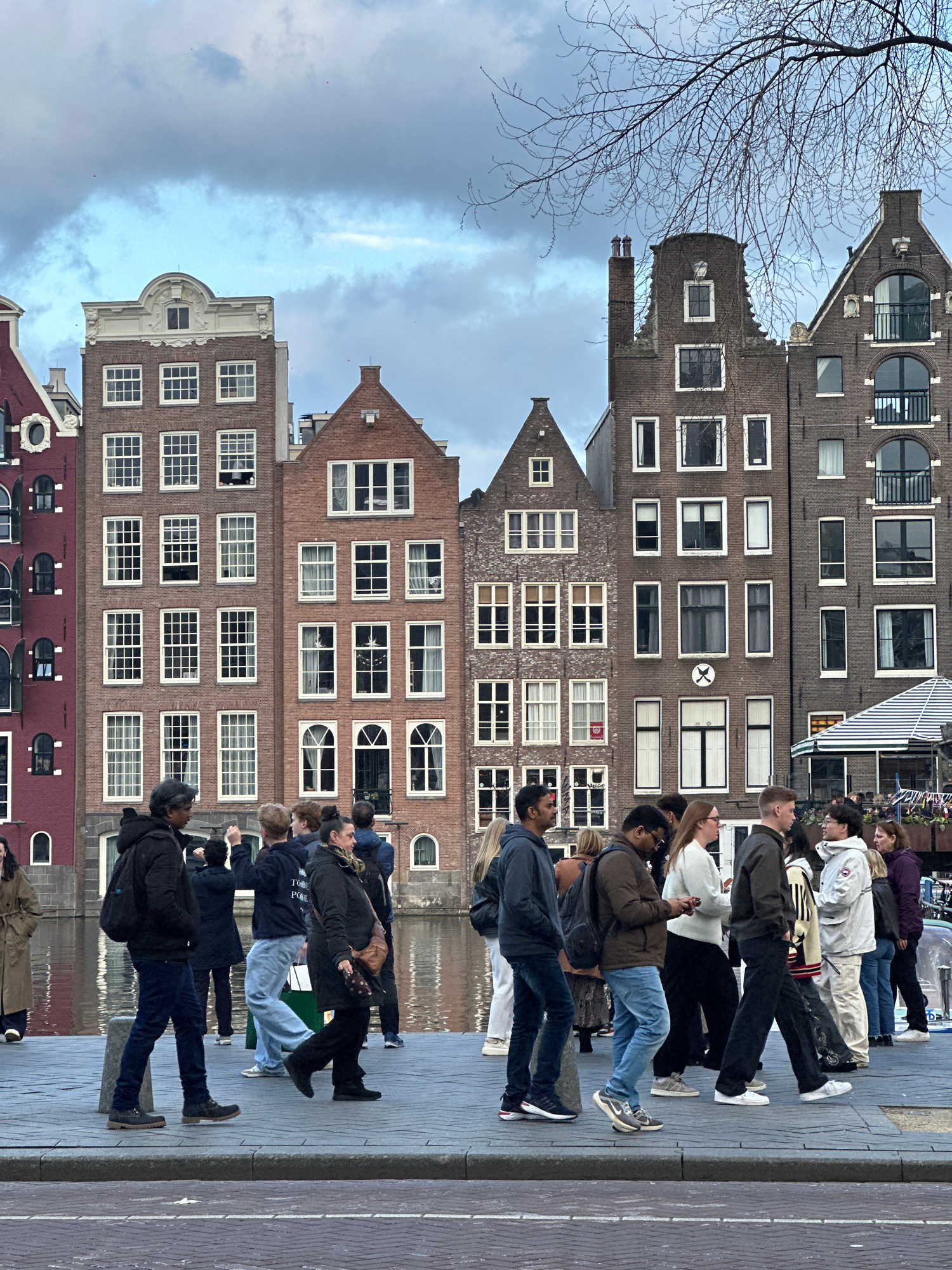 The photograph shows a group of people lined up along a canal in Amsterdam, Netherlands, likely admiring or taking photos of the historic canal houses. The architecture of the buildings is characteriz…read more