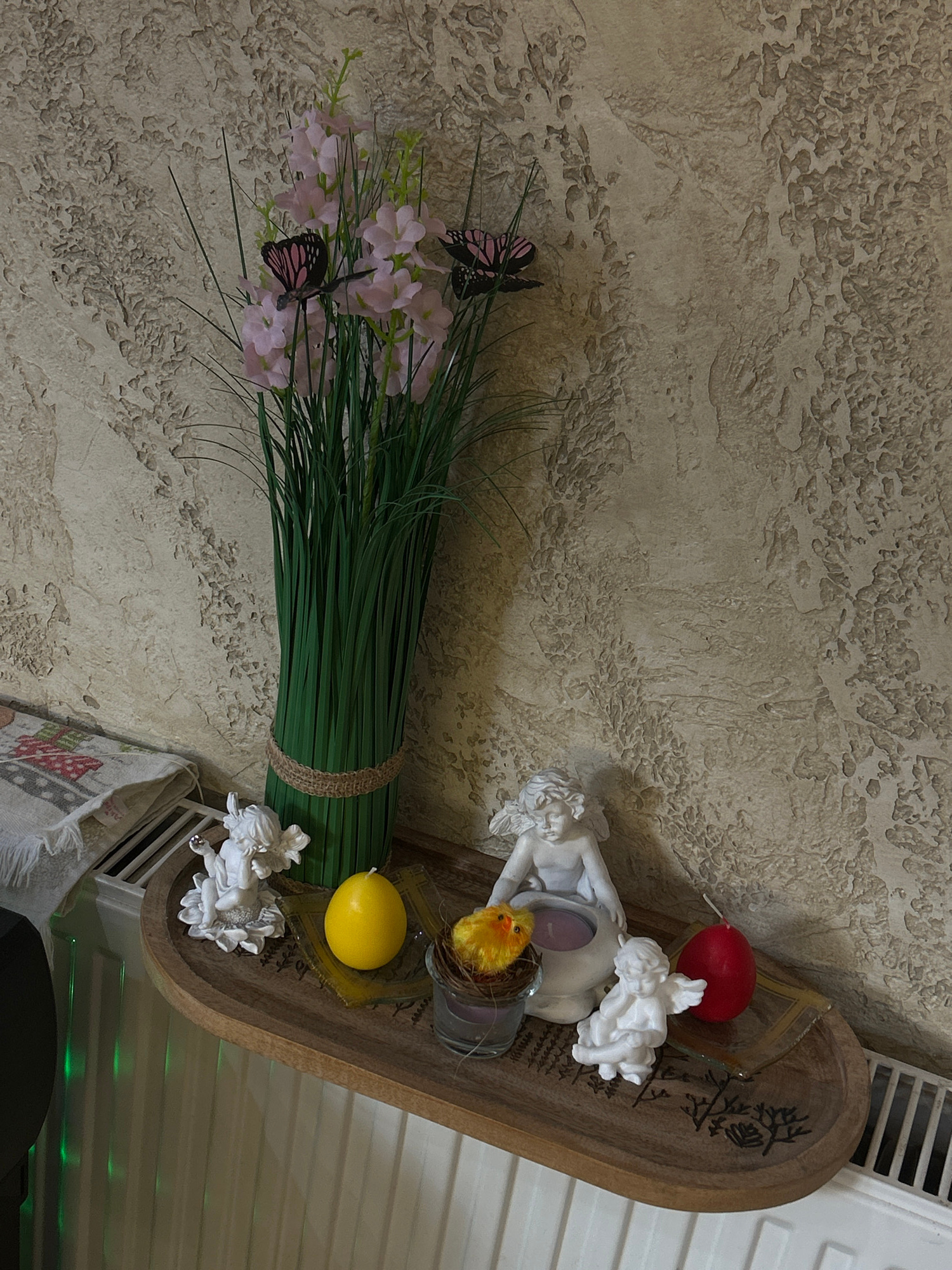 A high-angle shot shows a decorative arrangement on a wooden tray, likely indoors, in Bukovlak, Bulgaria. The tray holds a bouquet of light purple flowers with two butterfly decorations, a bundle of gā¦read more