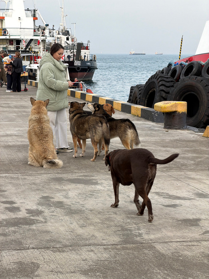 A daytime scene depicts a concrete pier at the port of Batumi, Georgia. In the foreground, a dark brown dog wearing a red collar walks away from the viewer toward the lower right. The pier surface exh…read more