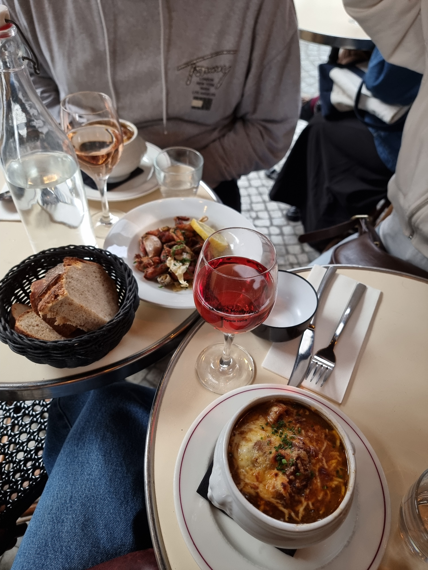 The image shows an overhead view of a table at a Parisian cafe. The table is circular with a beige top and a metal rim. A person wearing a gray sweatshirt is partially visible on the left side of the…read more