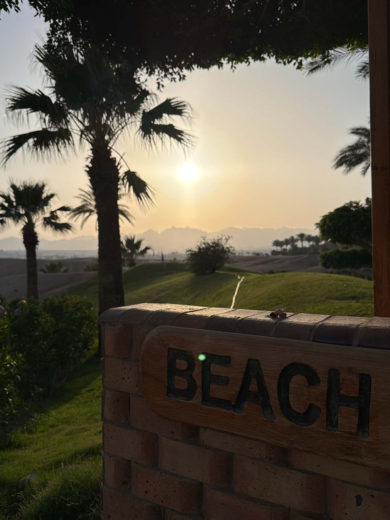 The image captures an outdoor, sun-drenched landscape, likely at sunrise or sunset, with a prominent wooden sign on the right. The sign, attached to a reddish-brown brick pillar, clearly displays the…read more