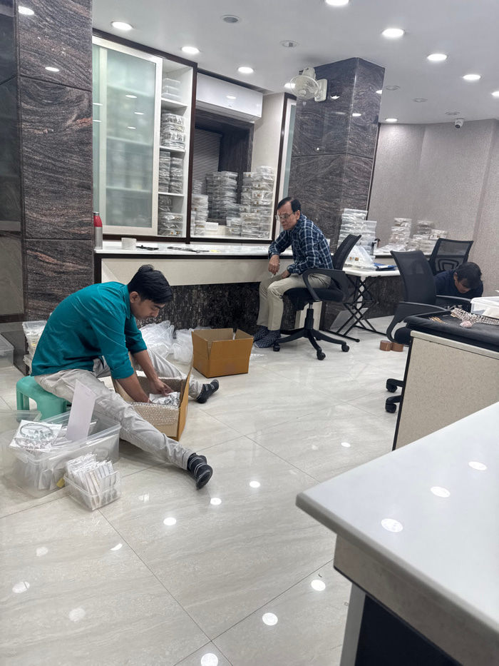 The image shows an indoor commercial workspace, located in Kolkata, India. The area features light-colored, polished tile flooring and columns clad in dark, mottled granite-like material. The walls ar…read more