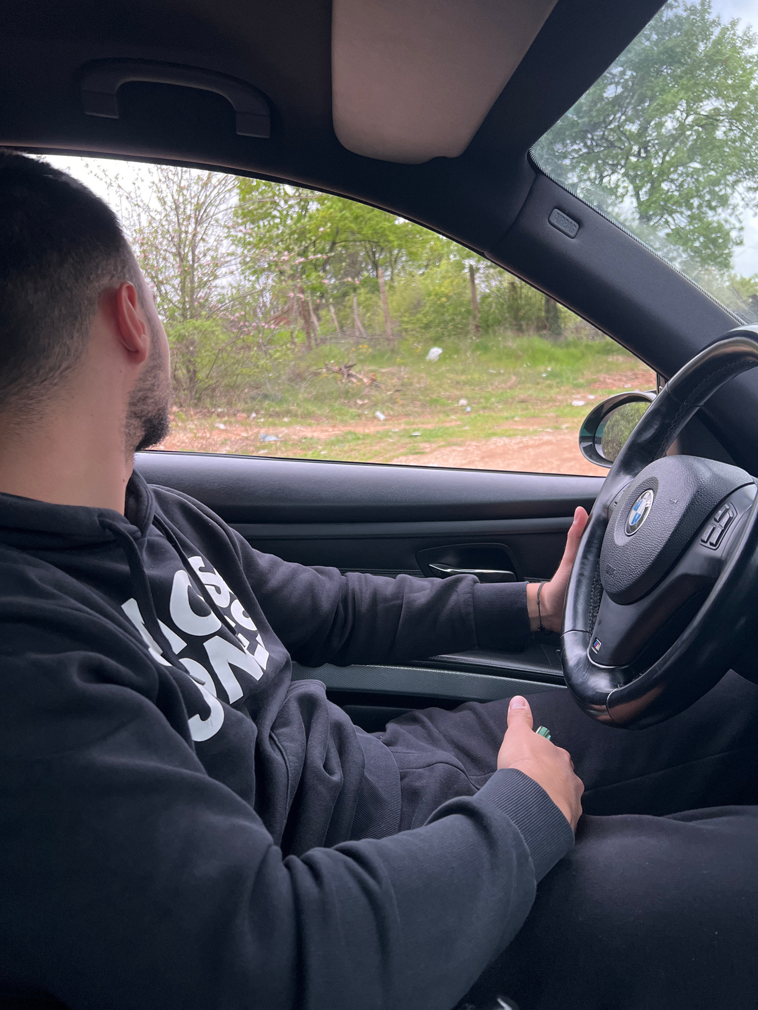 The image, oriented sideways, captures the interior of a car with a person in the driver's seat. The person wears a black hoodie with white text partially visible on the front. Their right hand rests…read more