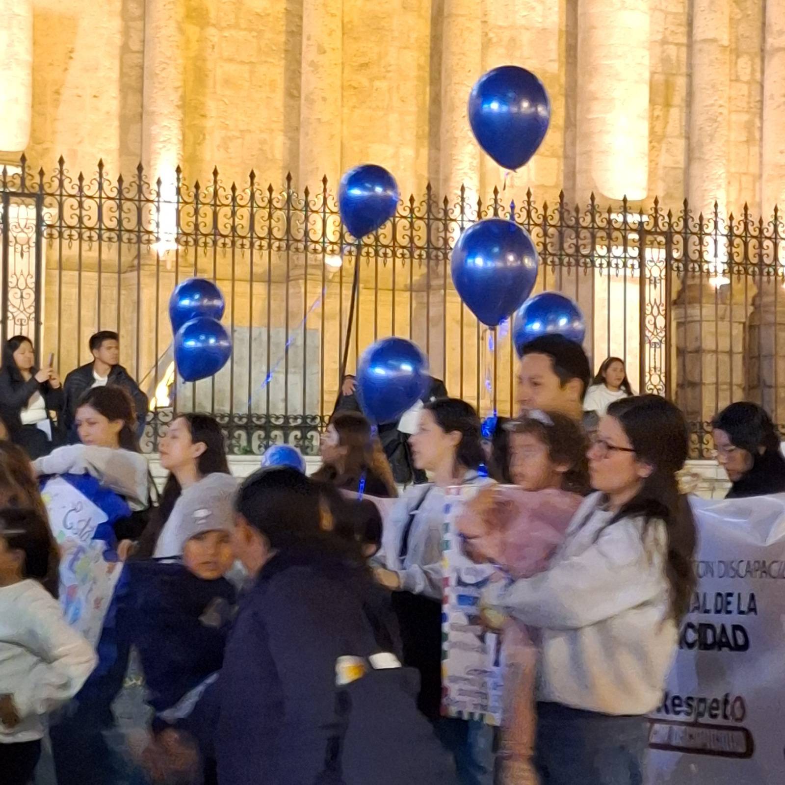 In Arequipa, Peru, a group of people stands near a wrought-iron fence and a stone building. Seven blue balloons are visible near the fence, and some of the people appear to be looking down. One personβ¦read more
