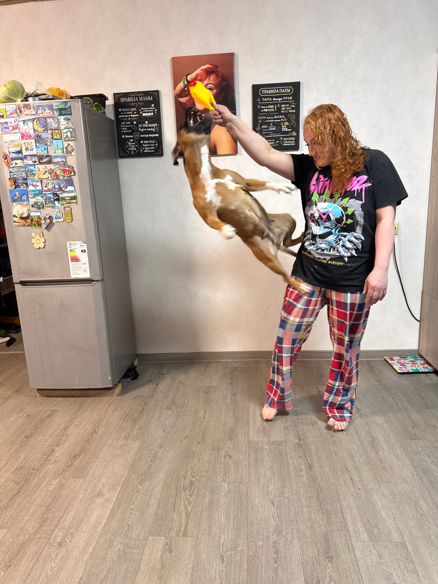 A man with long red hair, wearing a black t-shirt and plaid pajama pants, is playing with a dog in a kitchen. The dog is leaping towards a yellow toy in the man's hand. The kitchen features a refriger…read more