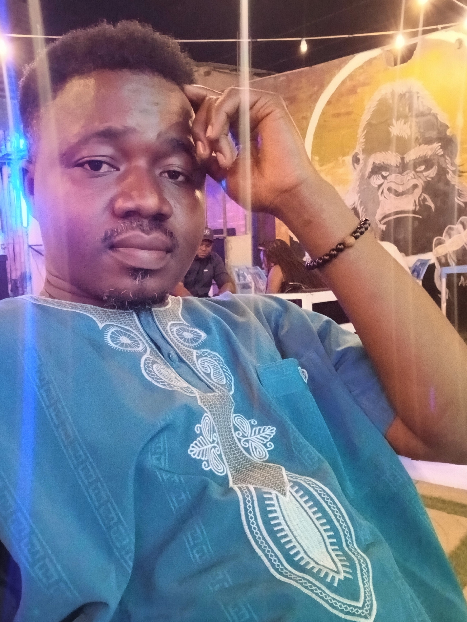 A man with a dark complexion, mustache, and short, curly hair is posing for a selfie. He is wearing a blue shirt with white embroidery around the collar. The background features a mural depicting a go…read more