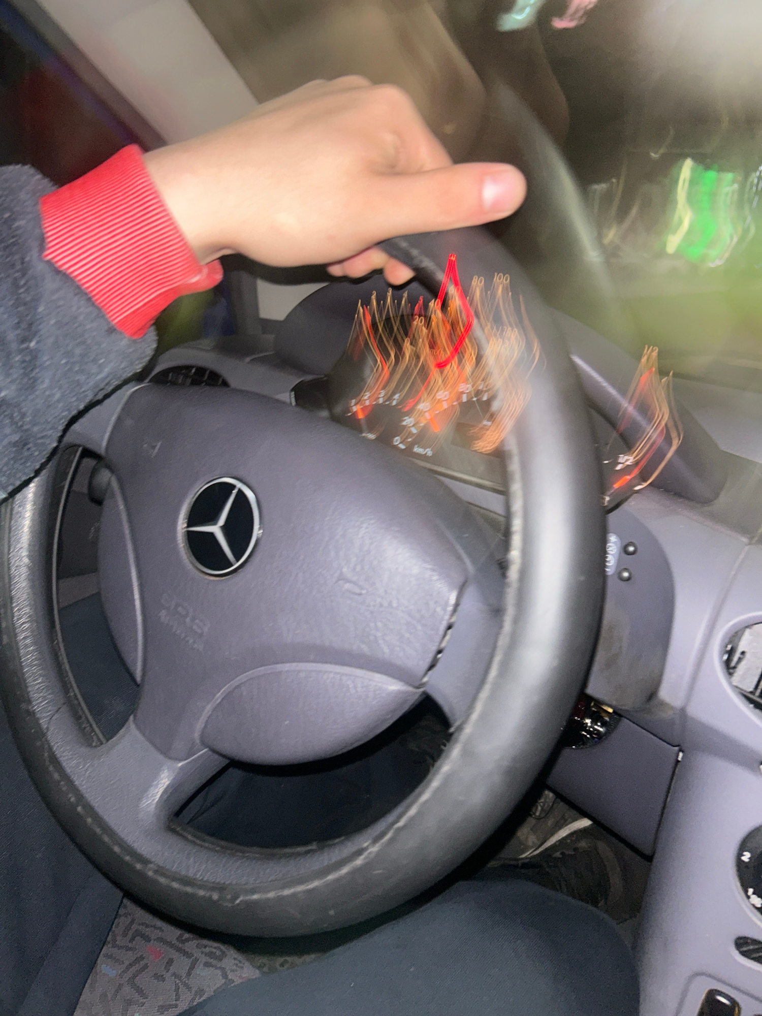 The image depicts the interior of a vehicle, specifically the driver's side. A hand is visible gripping the steering wheel, which features a Mercedes-Benz logo. The dashboard and instrument panel are…read more