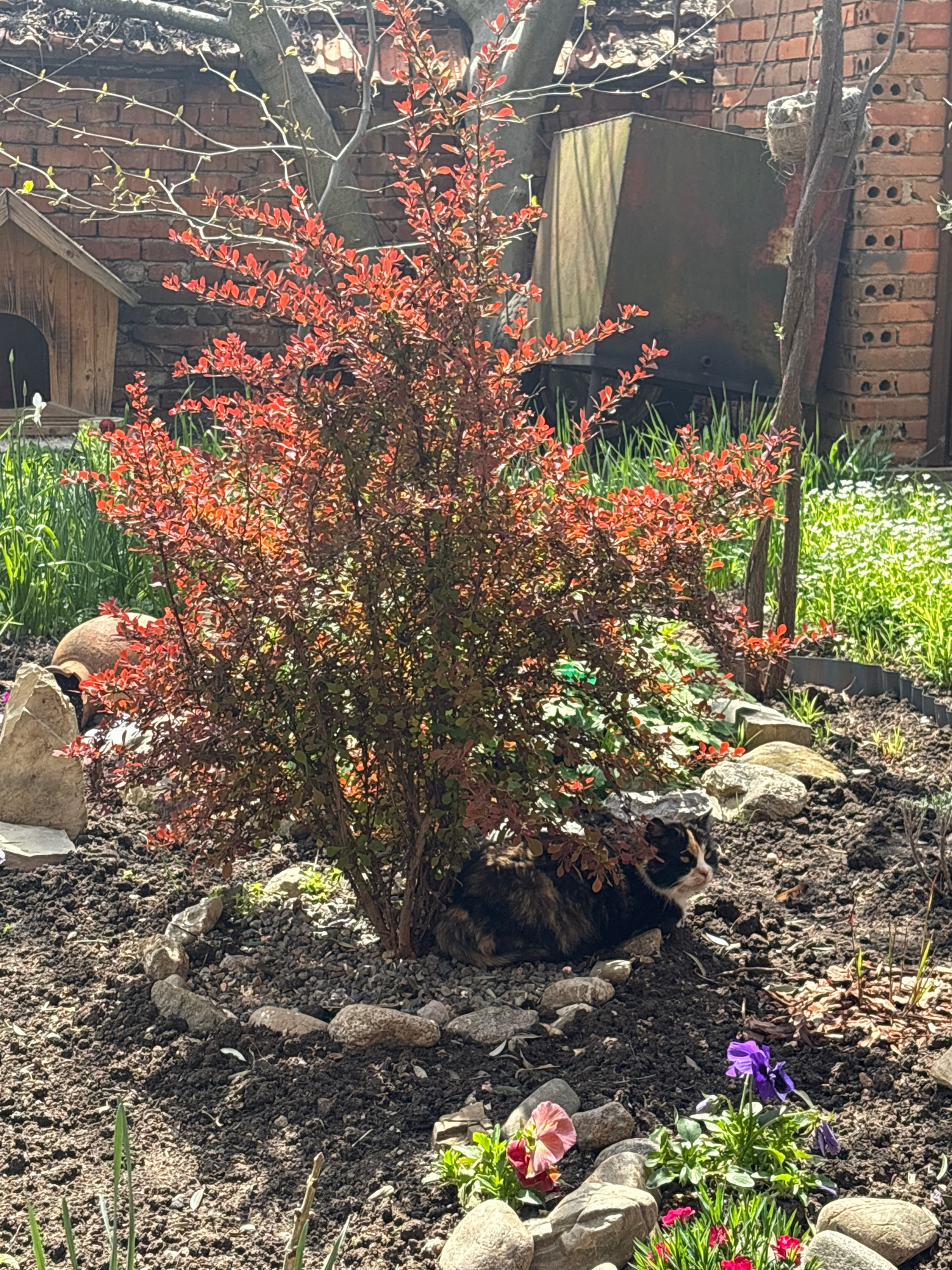 The scene depicts a garden bed in an outdoor setting. A multicolored cat is present, nestled near a bush with reddish leaves, likely a Japanese barberry. The garden bed is encircled by a border of medβ¦read more