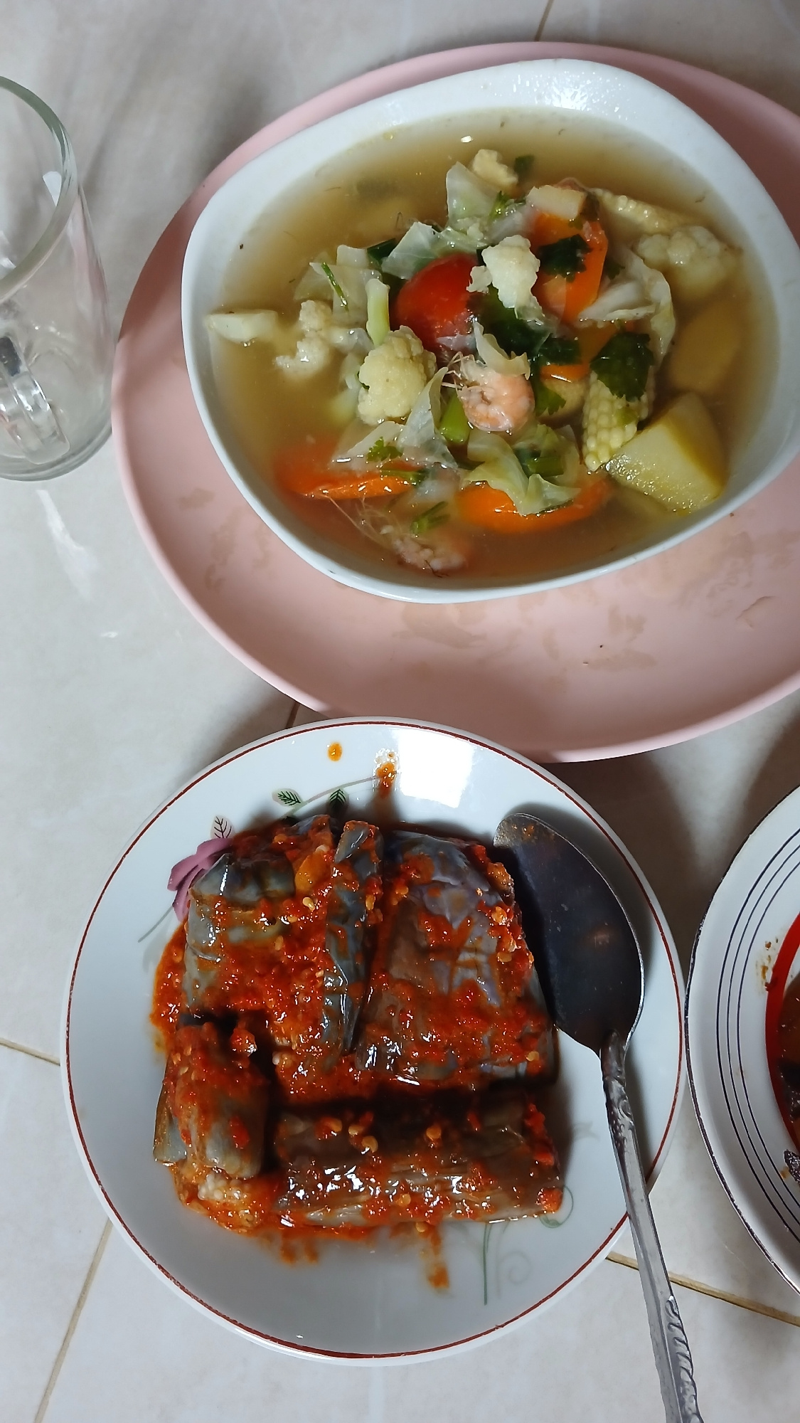 A top-down shot reveals two dishes on a white-tiled surface. On the left, a white bowl sits on a pink plate, containing a clear soup filled with mixed vegetables, including cauliflower, cabbage, carro…read more