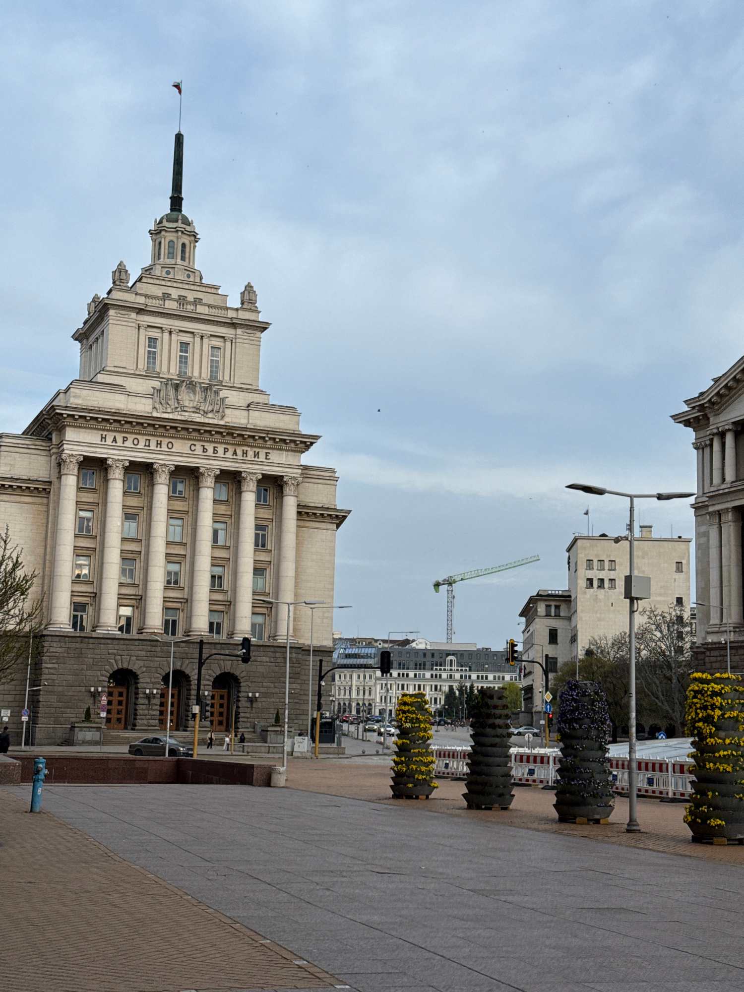 The image captures a daytime urban scene in Sofia, Bulgaria, featuring the majestic National Assembly building under an overcast sky. The central subject is a grand, light-colored neoclassical buildi…read more