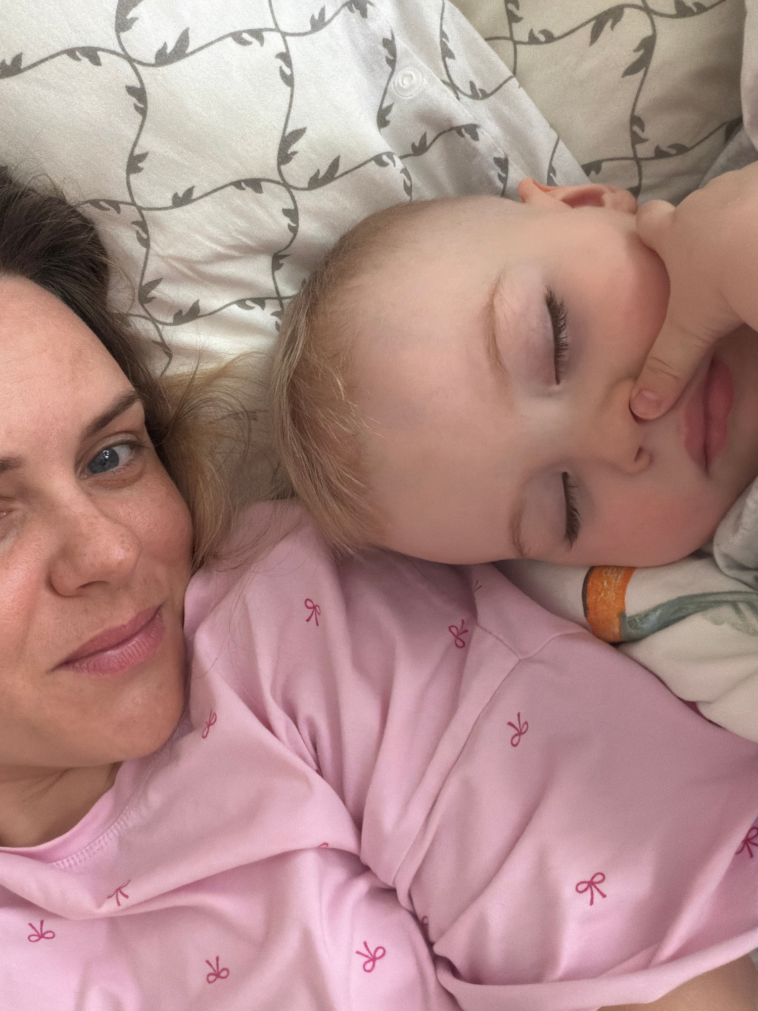 A woman and a young child are lying on a bed. The woman, positioned at the bottom of the frame, has her head tilted towards the camera, revealing part of her face. She has light skin, blondish-brown h…read more