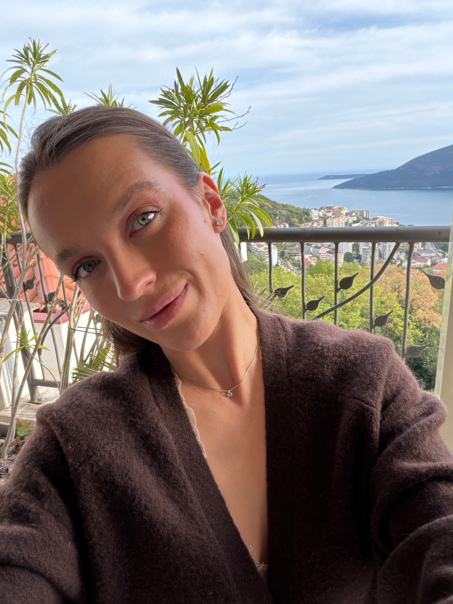 A portrait photograph shows a woman with light skin, brown hair, and green eyes. She is wearing a brown cardigan and a delicate silver necklace. The background reveals a view of the city of Trebesin,…read more