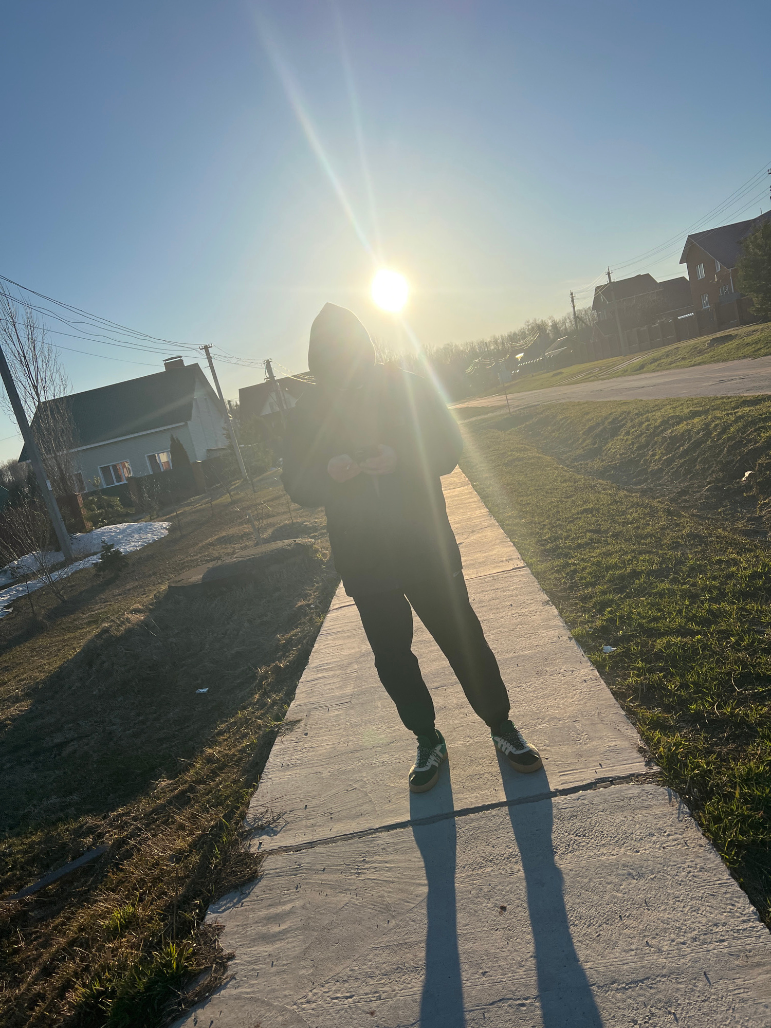 The image depicts a figure standing on a concrete sidewalk next to a grassy area with some dry patches, possibly in Noviy, Russia. The sun is positioned in the background, creating a strong backlight…read more