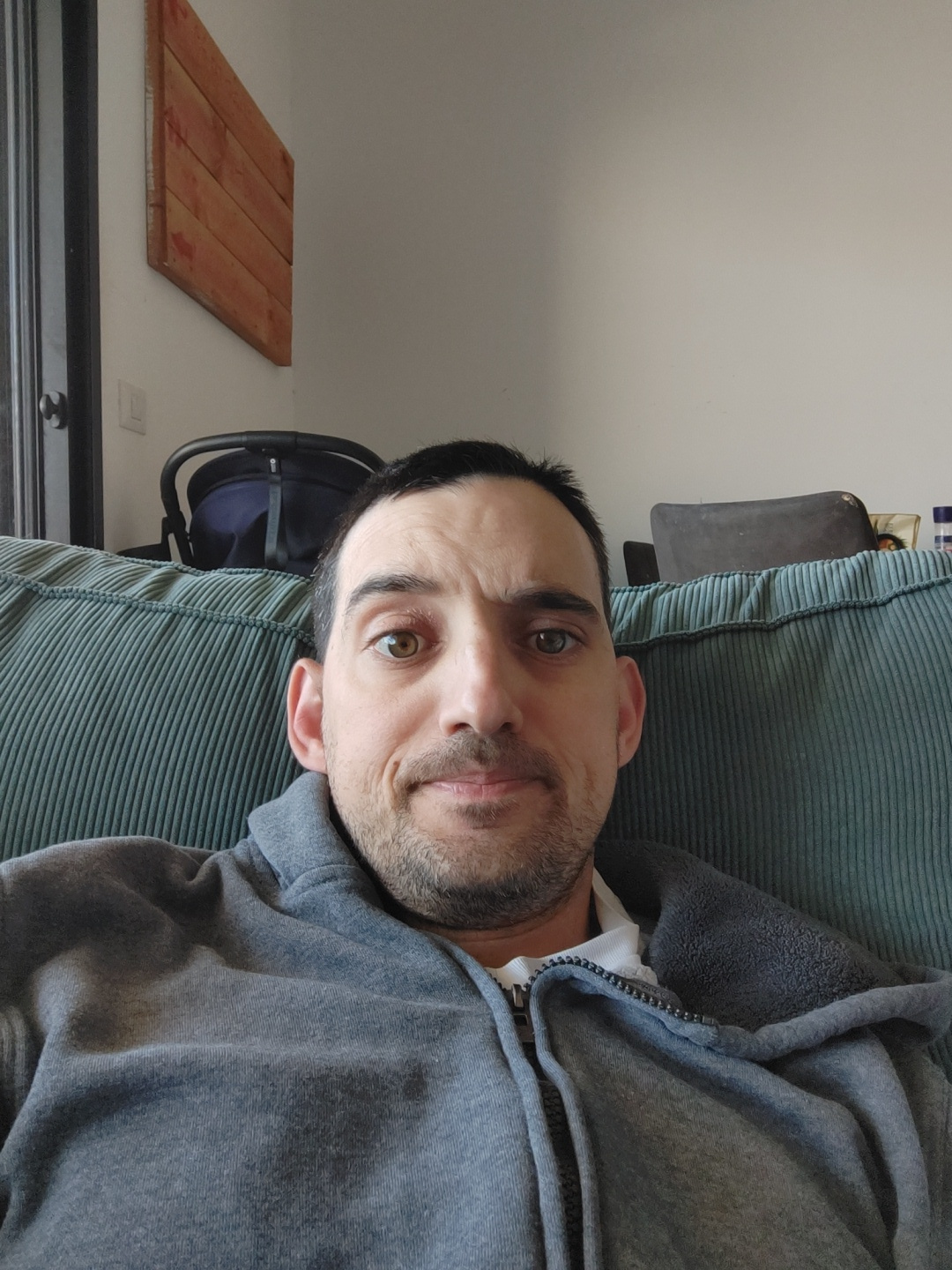 A medium shot depicts a man with short, dark hair and a salt-and-pepper beard, wearing a gray zip-up hoodie, lying on a green corduroy cushion. The man is looking directly at the camera with a slight…read more