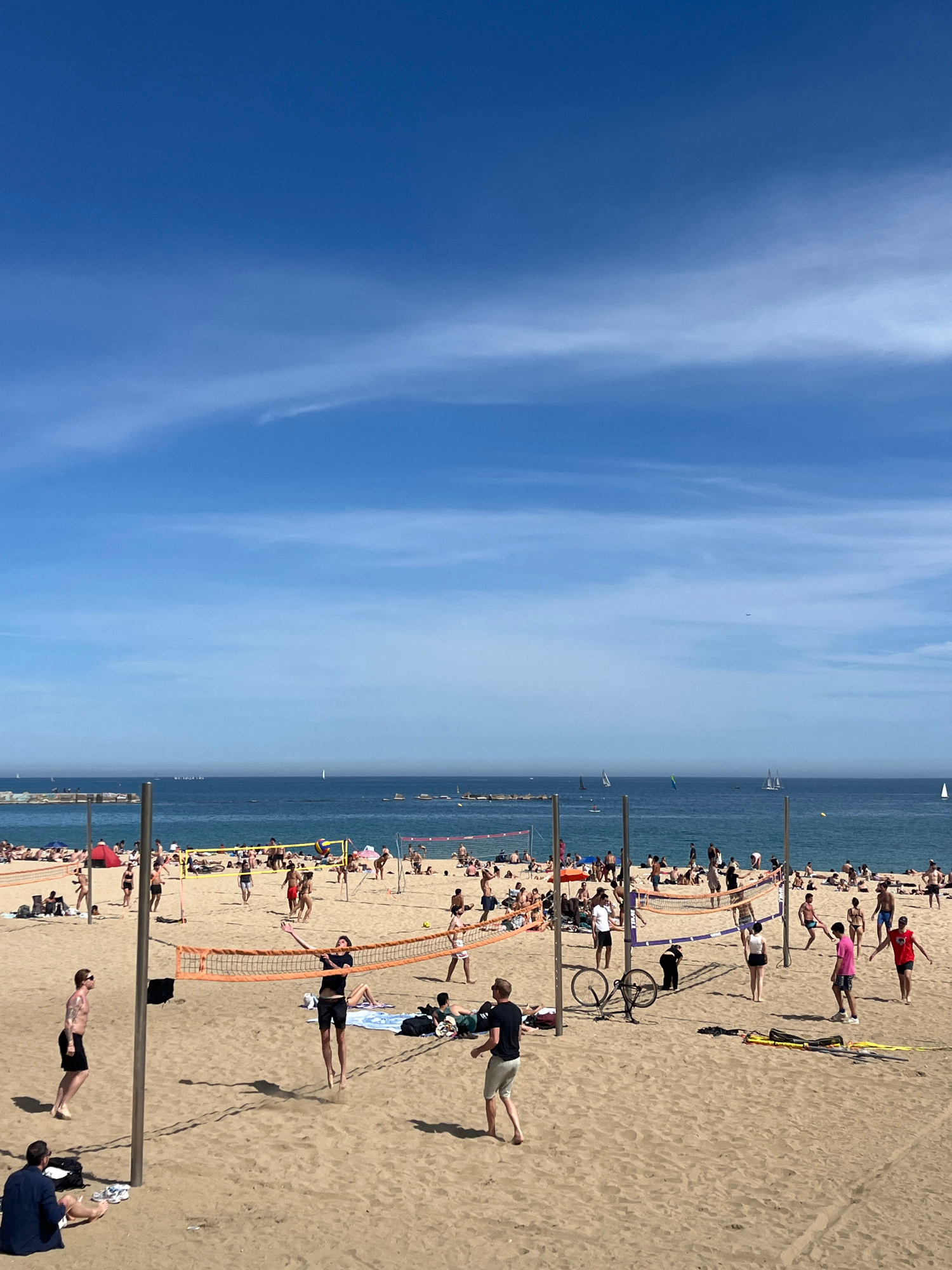 The image depicts a sunny day at Barceloneta Beach in Barcelona, Spain. The scene is split between a clear blue sky with some light clouds and a crowded sandy beach. The Mediterranean Sea is visible i…read more