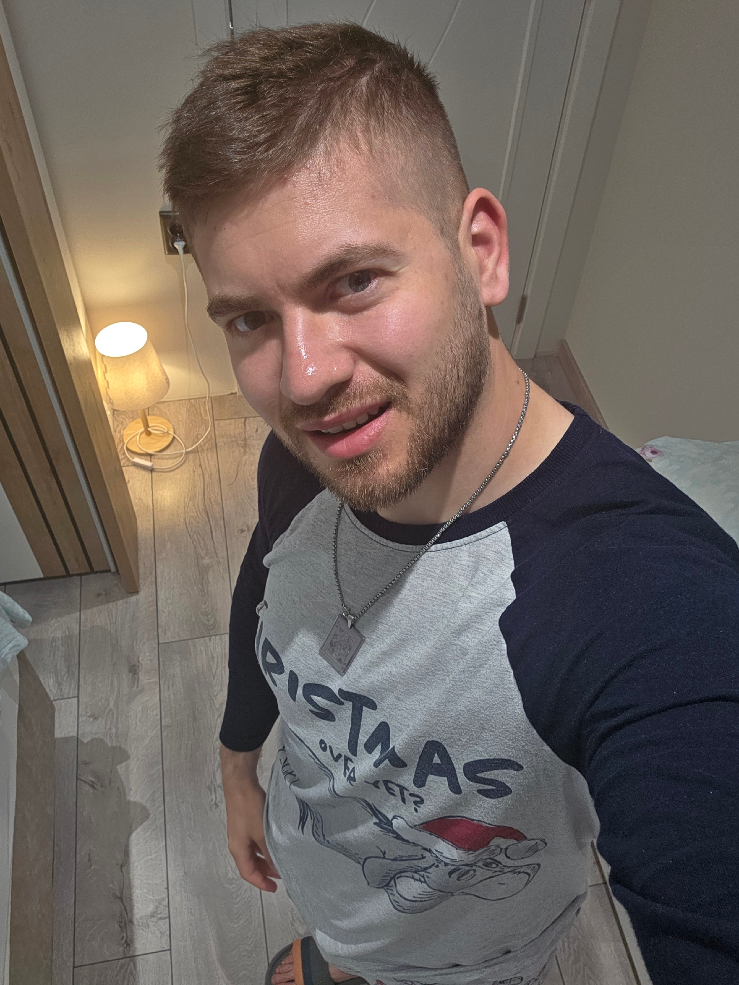 The photograph shows a man with short, light brown hair and a trimmed beard, wearing a gray t-shirt with a black long-sleeved under shirt and a necklace with a pendant. He appears to be indoors, possi…read more