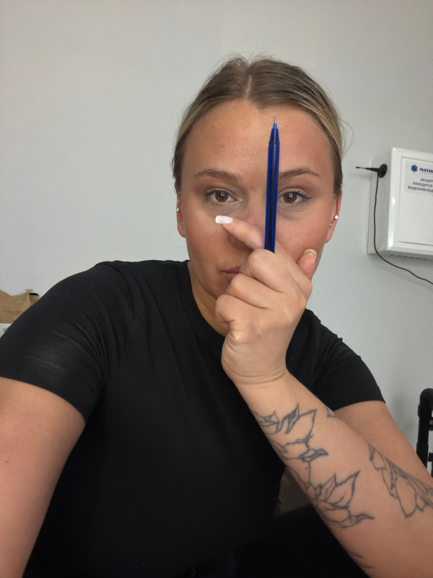 A woman with fair skin and light brown hair is holding a blue pen horizontally across her forehead. She is wearing a black shirt and has a floral tattoo on her left arm. She is looking directly at the…read more
