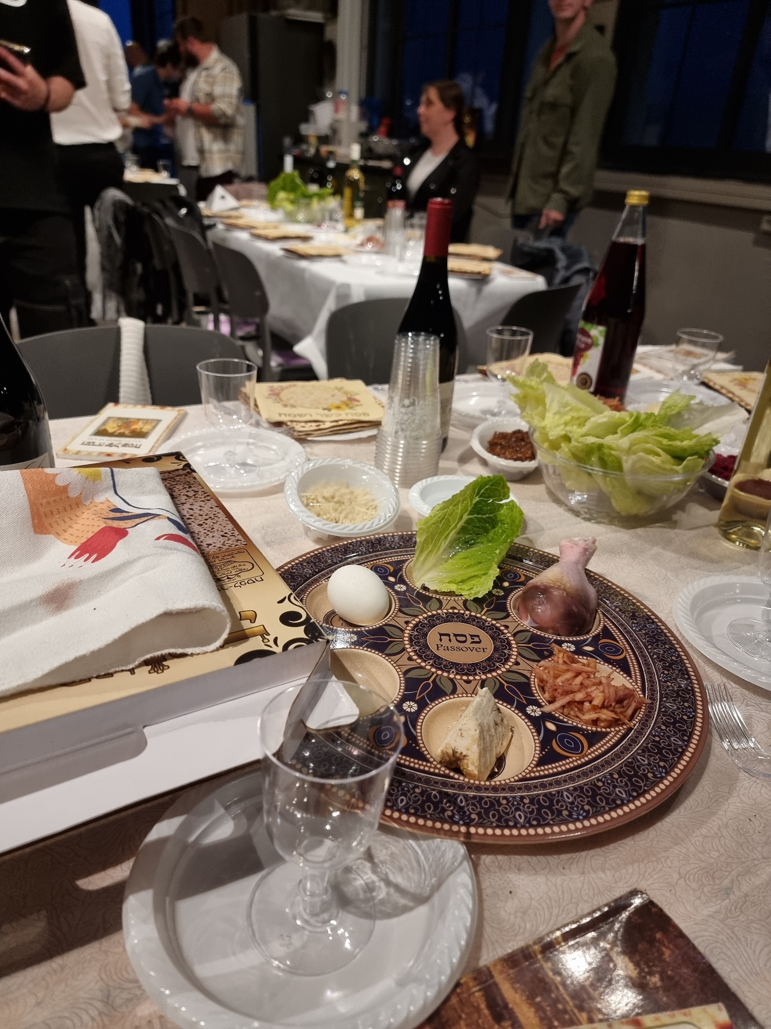 The image captures a Passover Seder table setting, likely indoors. Dominating the scene is a Seder plate with traditional symbolic foods arranged in designated sections. There's a shank bone, lettuce,…read more