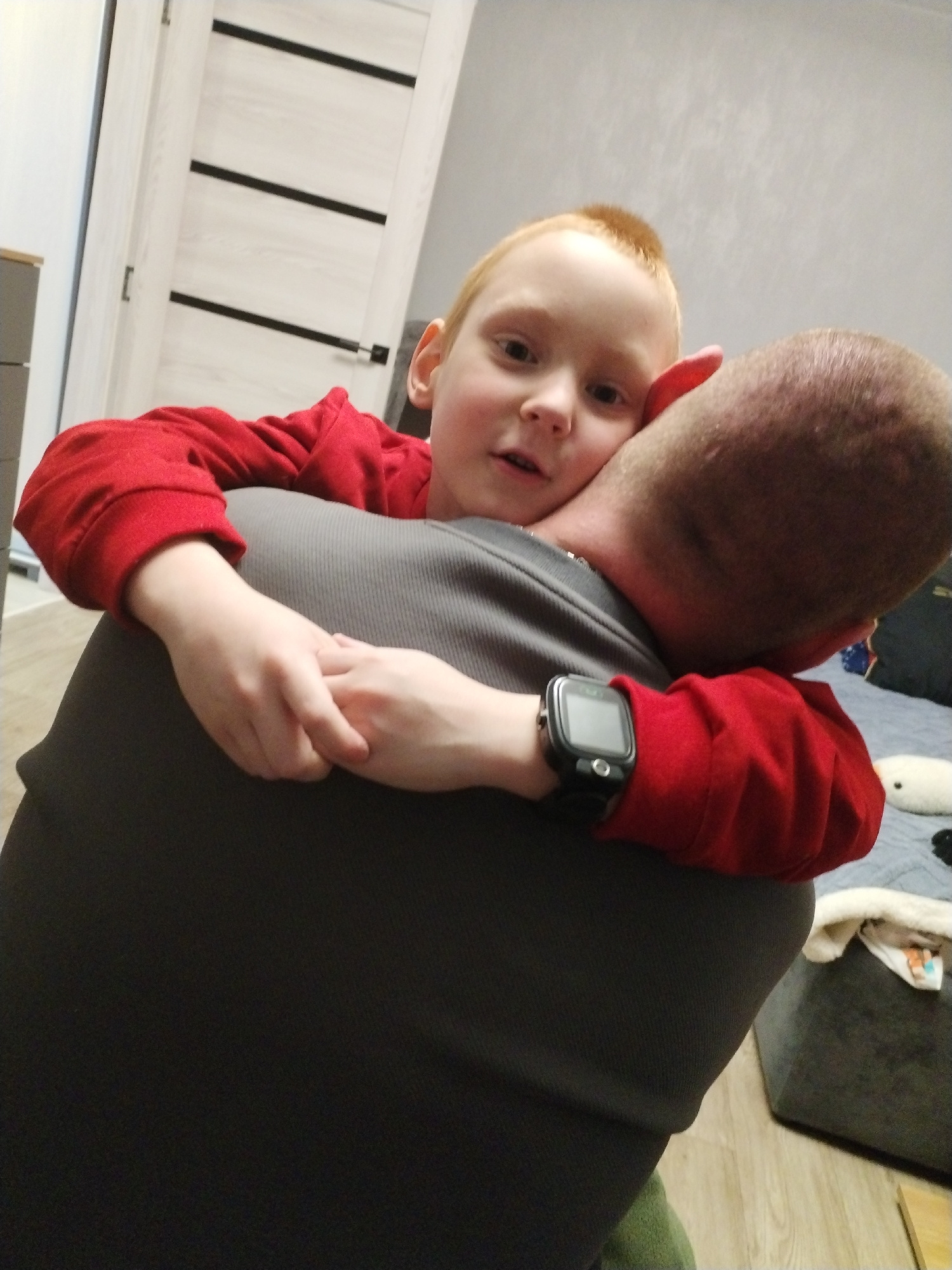 A fair-skinned child with red hair, wearing a red long-sleeved shirt and a watch on his wrist, is hugging a man with a bald head. The man is wearing a gray shirt. They are indoors, and behind them is…read more