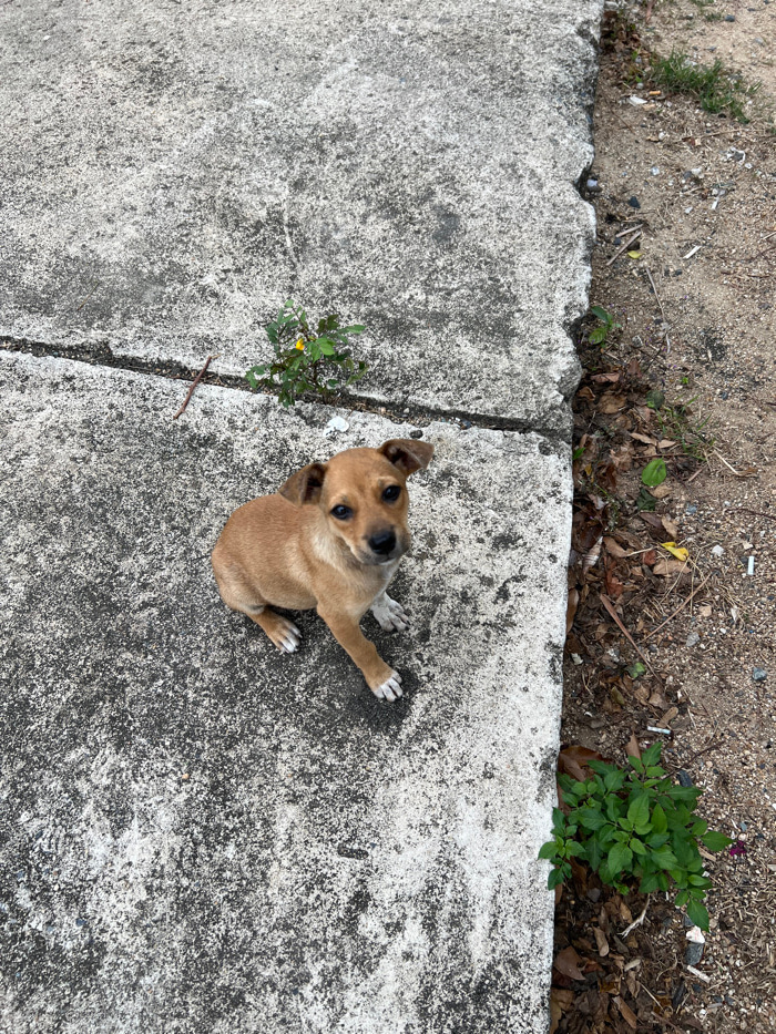 A small, light-brown puppy sits on a concrete slab. The puppy faces the camera, looking up with one ear perked. The concrete is worn and textured, with a crack running alongside the puppy. A small pat…read more