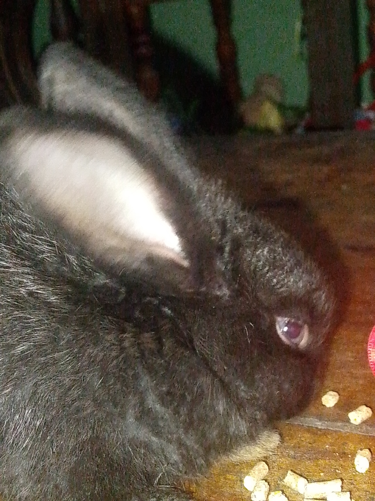 A close-up image depicts a black rabbit on a brown surface with scattered dry food pellets. The rabbit's left ear is prominently visible, showing a light grey interior. The rabbit's eye is open and vi…read more