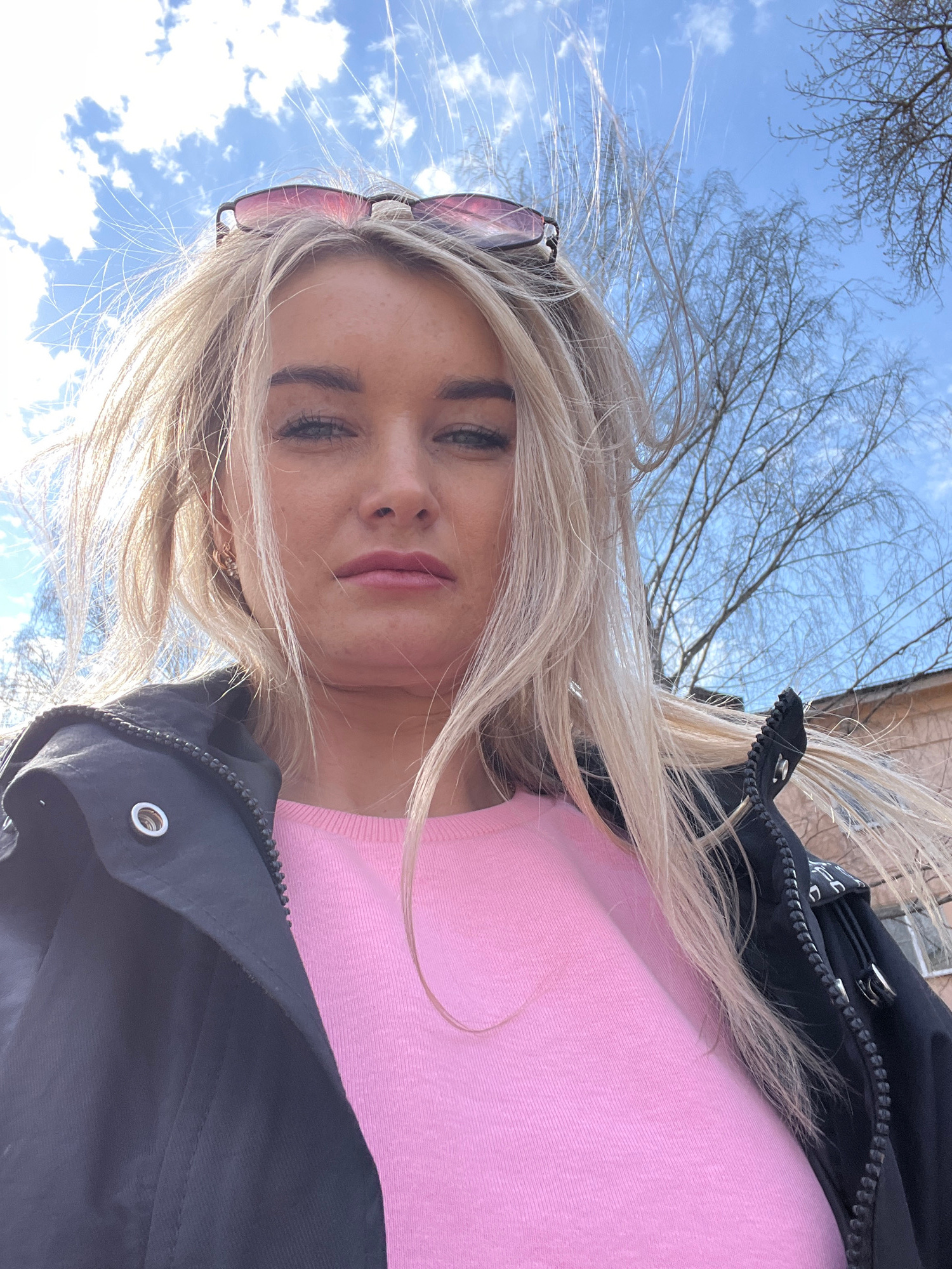 The image is a rotated close-up selfie featuring a young woman outdoors in Chaikovsky, Russia. She has long, windswept blonde hair, fair skin, and light-colored eyes, with light makeup visible on her…read more
