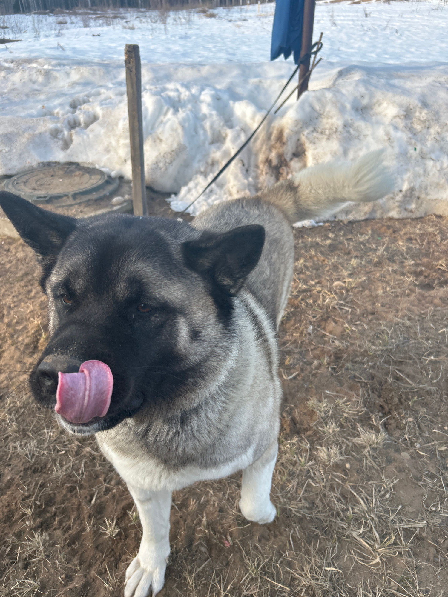 This image, taken in Noviy, Russia, depicts a large Akita-type dog with a black muzzle, ears, and facial mask, and a grey-tan body with white underparts and legs. The dog is positioned in the foregrou…read more