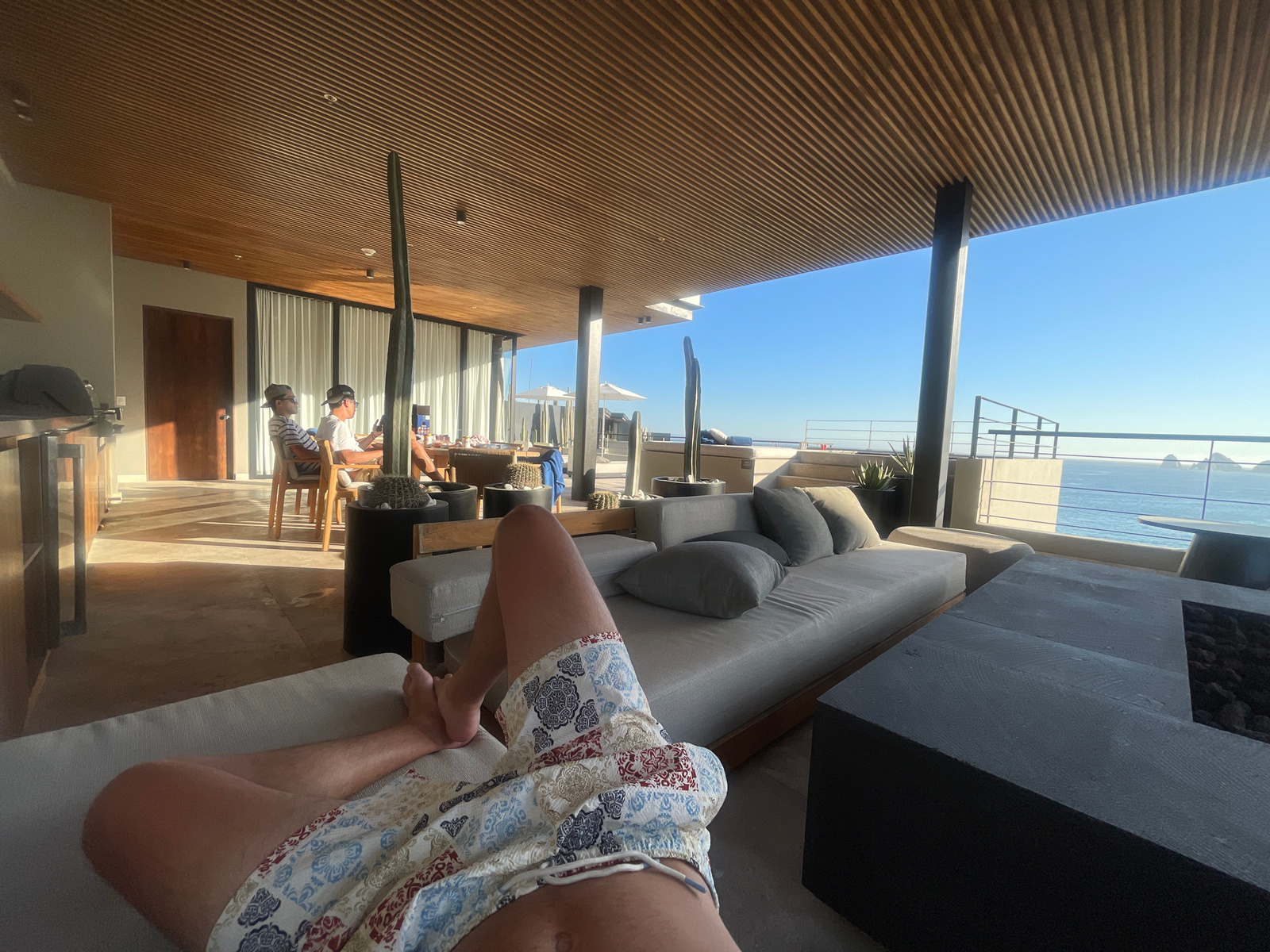 A first-person perspective photograph captures a partially-clad individual reclining on a cushioned lounge area in an open-air, upscale setting. The subject's torso and legs, clad in patterned swim tr…read more