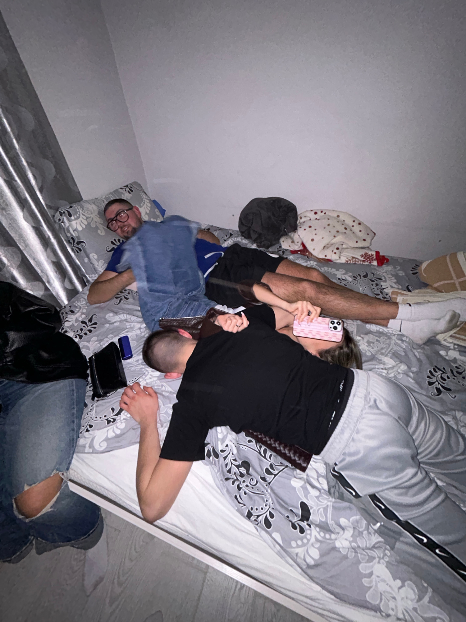 Scene: Interior bedroom. Three individuals are visible. People: - Individual 1: Lying prone on a bed, wearing glasses and a blue shirt. - Individual 2: Lying prone on the bed, wearing black clothing.…read more