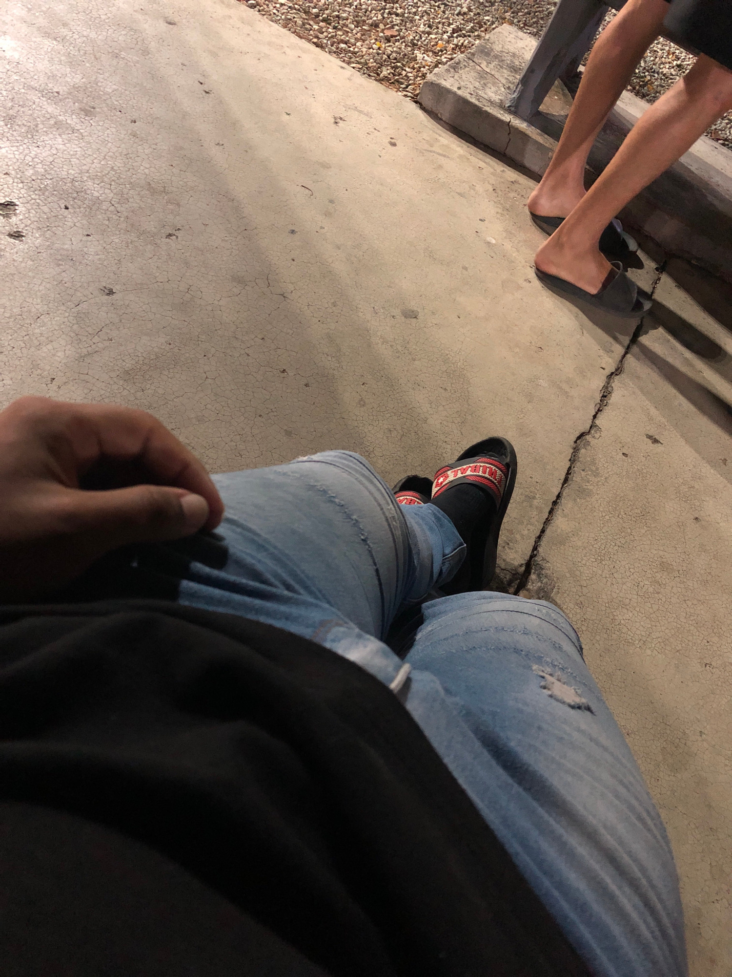 The image shows a concrete surface with a crack running through it. To the left, there are two sets of human legs, one wearing dark slides. To the right, there is a person wearing light blue jeans wit…read more