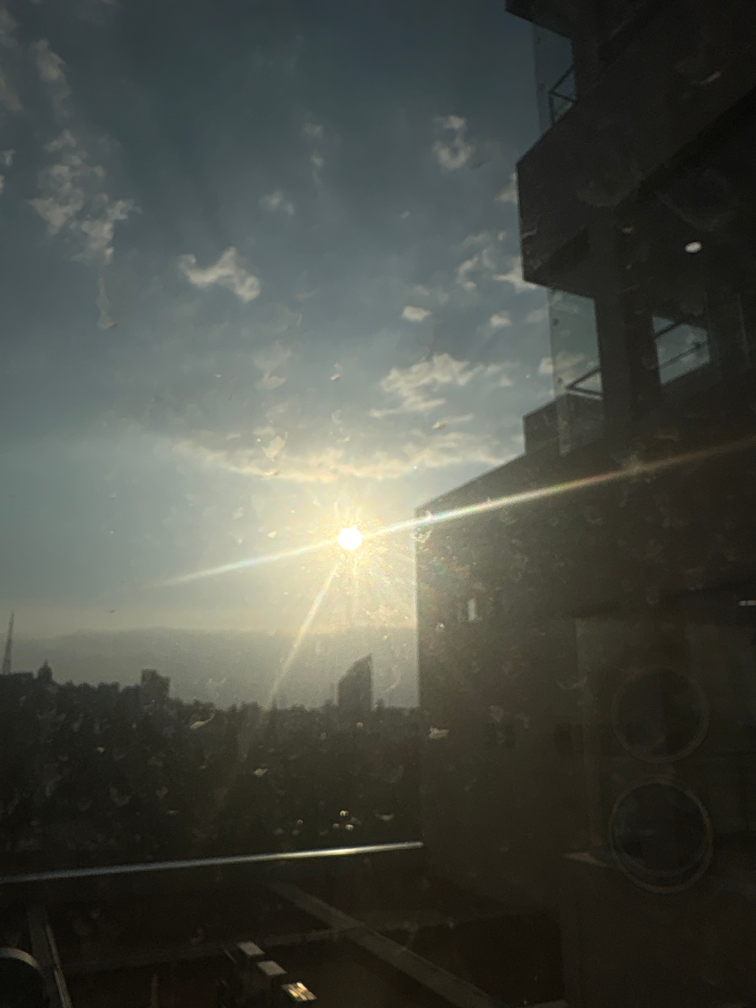 The image shows a reflection in a dirty window. The reflection is of the sky with clouds and the sun. The reflection also includes the silhouette of a building and possibly a cityscape. It is difficul…read more