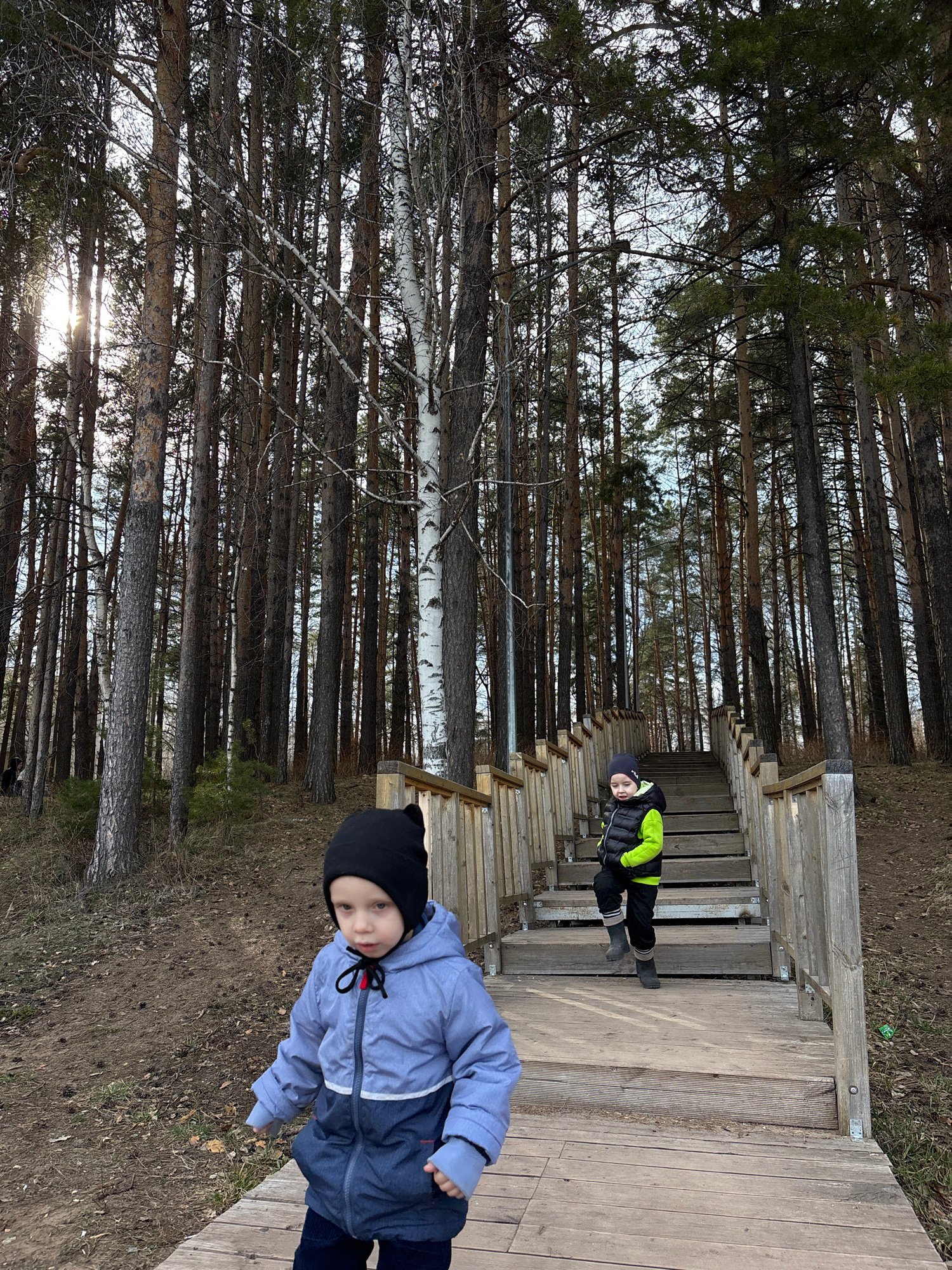 The image captures two young children on a wooden boardwalk or staircase within a dense forest. The scene depicts a cool season, likely late autumn or early spring, characterized by dry ground coveredβ¦read more