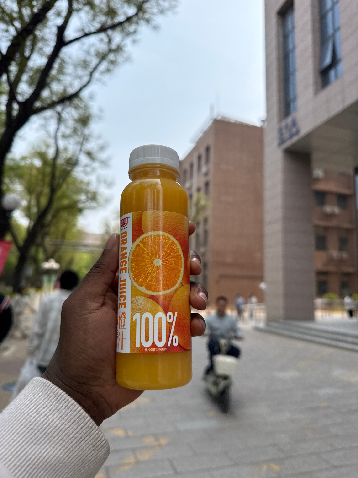 A bottle of orange juice is held up in a person's hand in front of a blurred city scene. The orange juice bottle is a plastic cylindrical shape with a white cap. The label shows a cross-section of an…read more