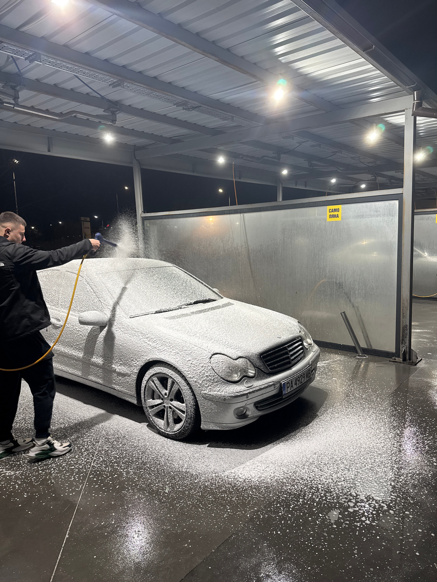 A man washes a silver Mercedes-Benz sedan with a foam cannon at a self-service car wash in Plovdiv, Bulgaria. The car is entirely covered in white foam. The man is wearing a black jacket and pants, an…read more
