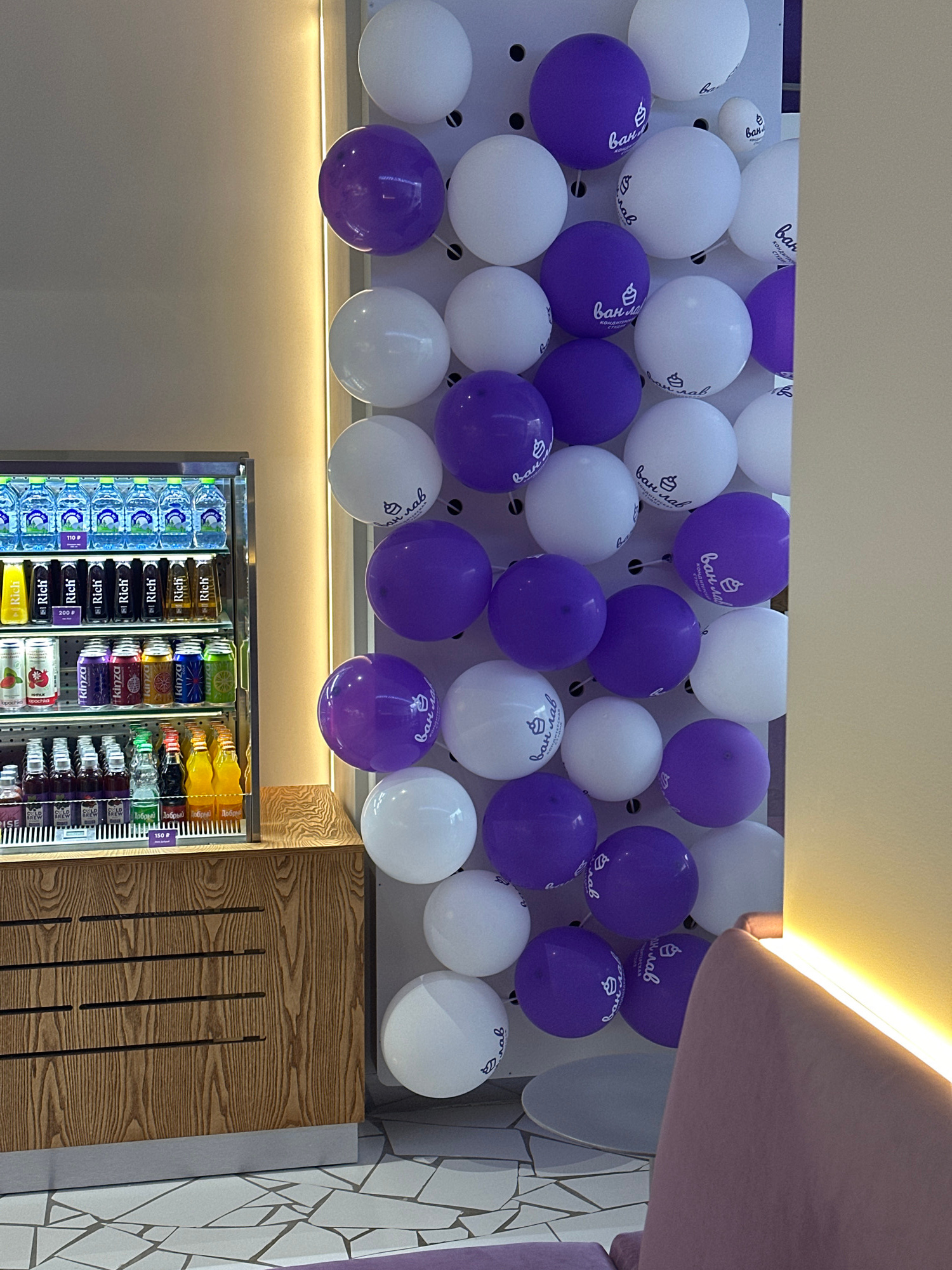 The image shows an interior space decorated with white and purple balloons that have the logo of "van-lav Konditerskaya Studiya" printed on them, suggesting it's a celebratory or promotional setting.…read more