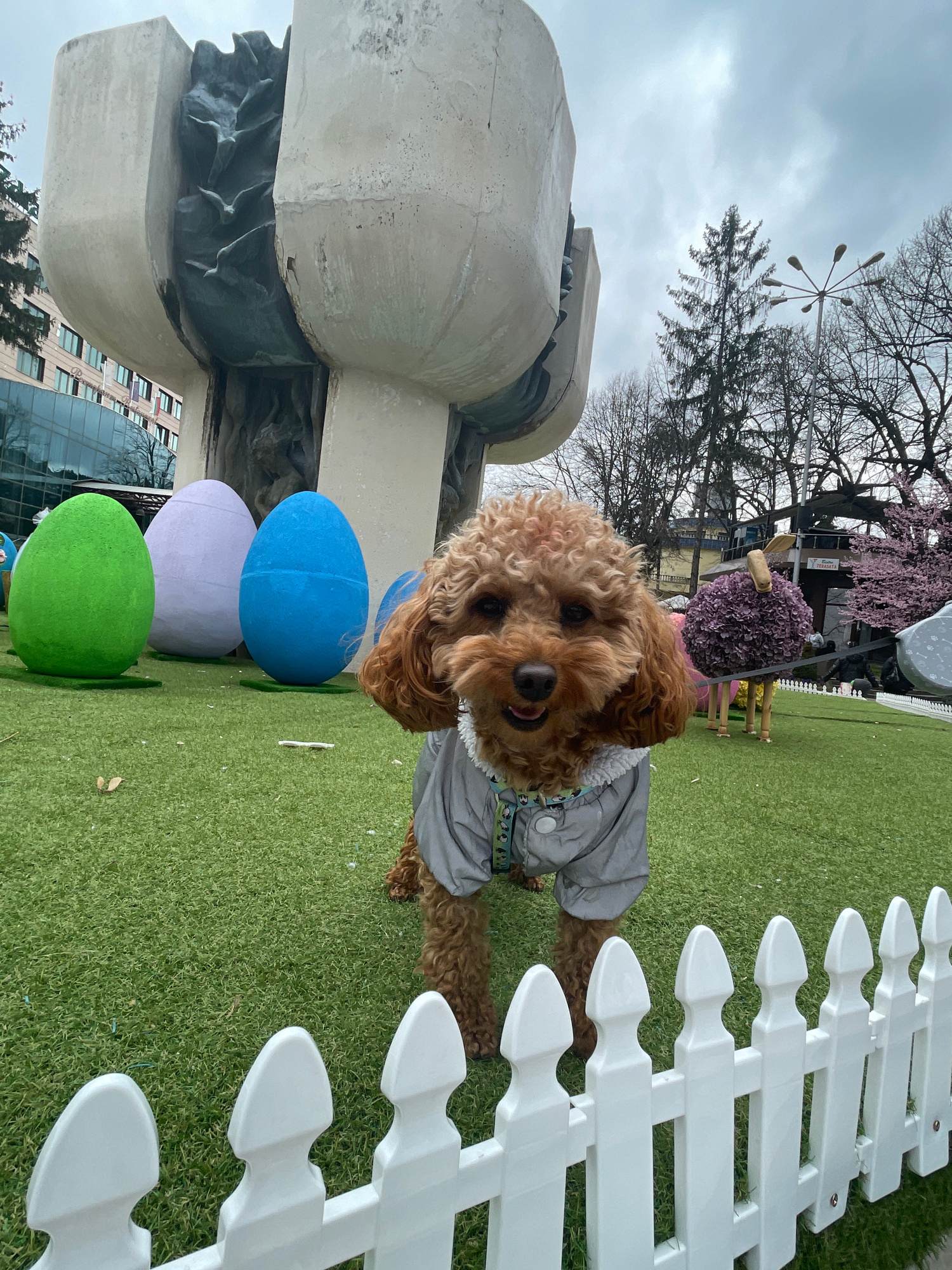 The image shows a brown, curly-haired dog wearing a gray jacket. The dog is positioned in front of a white picket fence and is next to three large, colorful Easter eggs (blue, lavender, and green). Be…read more